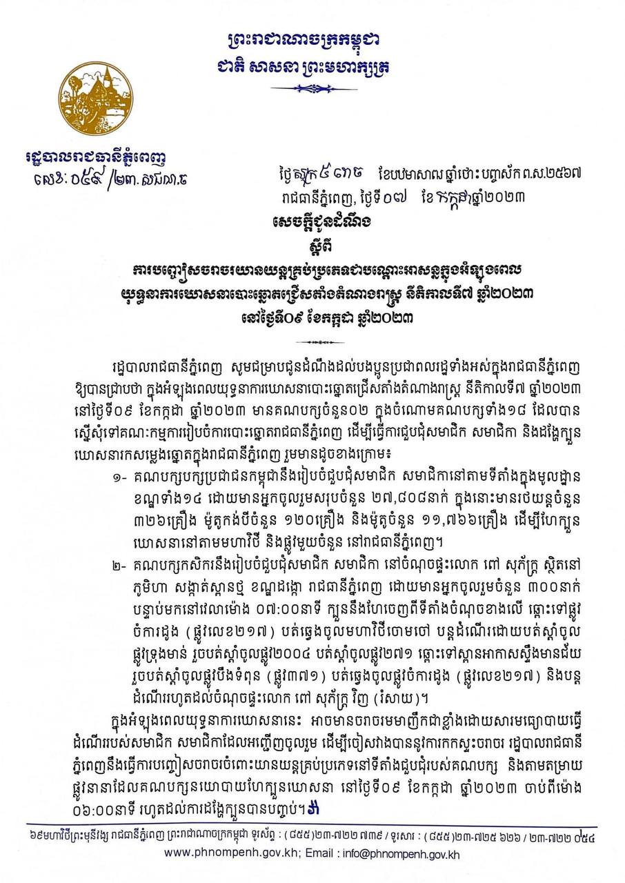 រដ្ឋបាលរាជធានីភ្នំពេញ សូមជម្រាបជូនដំណឹងដល់បងប្អូនប្រជាពលរដ្ឋទាំងអស់ក្នុងរាជធានីភ្នំពេញ ឱ្យបានជ្រាបថា ក្នុងអំឡុងពេលយុទ្ធនាការឃោសនាបោះឆ្នោតជ្រើសតាំងតំណាងរាស្ត្រ នីតិកាលទី៧ ឆ្នាំ២០២៣ នៅថ្ងៃទី០៩ ខែកក្កដា ឆ្នាំ២០២៣ មានគណបក្សចំនួន០២ ក្នុងចំណោមគណបក្សទាំង១៨ ដែលបាន ស្នើសុំទៅគណៈកម្មការរៀបចំការបោះឆ្នោតរាជធានីភ្នំពេញ ដើម្បីធ្វើការជួបជុំសមាជិក សមាជិកា និងដង្ហែក្បួន ឃោសនារកសម្លេងឆ្នោតក្នុងរាជធានីភ្នំពេញ រួមមានដូចខាងក្រោម៖