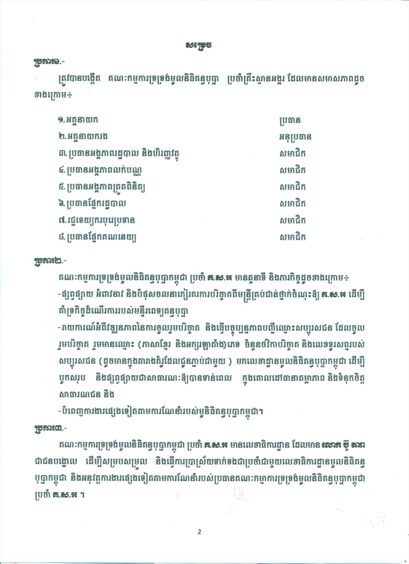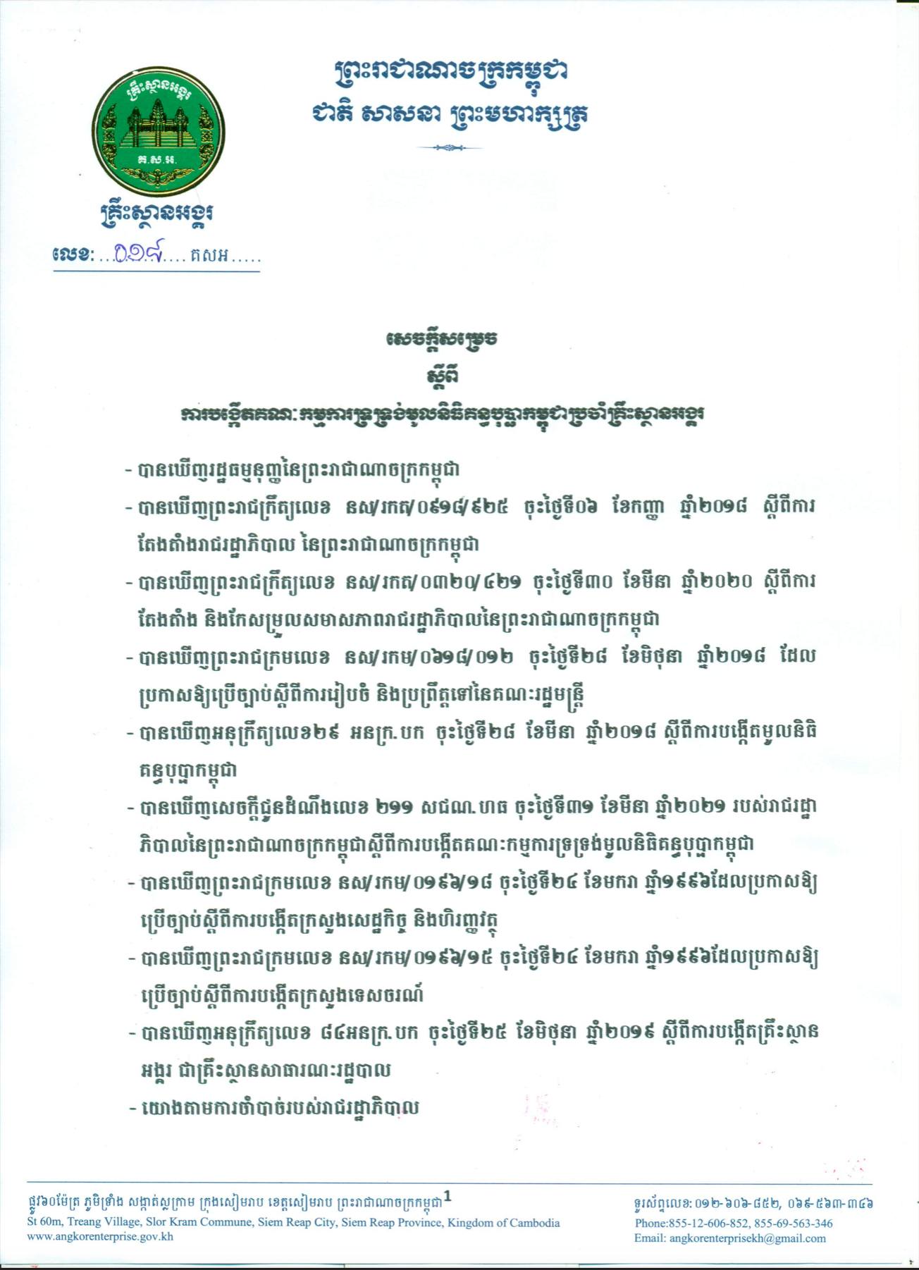 រាជធានីភ្នំពេញ៖ នៅថ្ងៃទី១០ ខែកក្កដា ឆ្នាំ២០២៣ យោងតាមសេចក្ដីប្រកាសរបស់ គ្រឹះស្ថានអង្គរ បានសម្រេចបង្កើត គណៈកម្មការទ្រទ្រង់មូលនិធិគន្ធបុប្ផាកម្ពុជា ប្រចាំគ្រឹះស្ថានអង្គរ ដែលមានសមាសភាពដូចខាងក្រោម៖