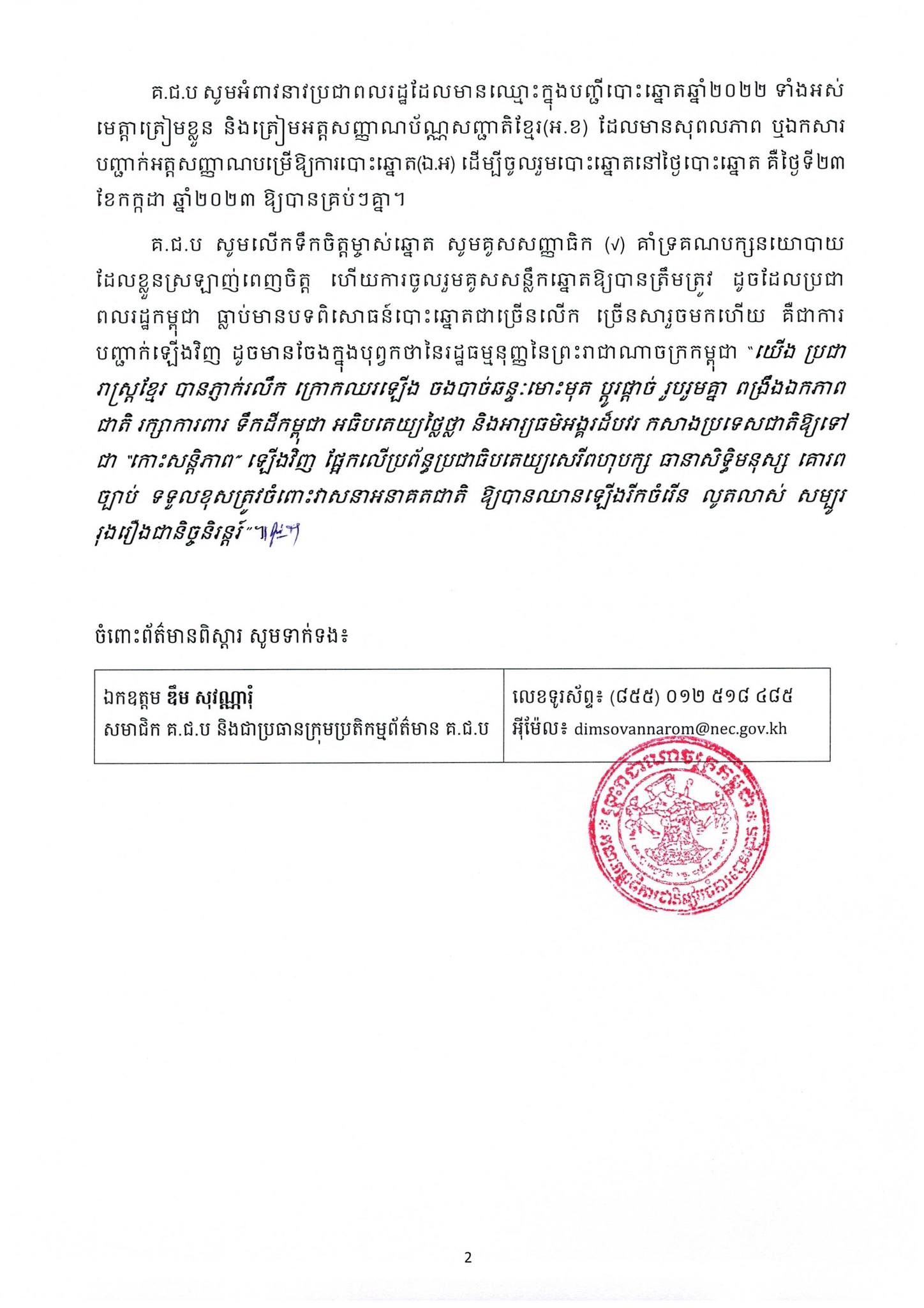 ផ្ទុយទៅវិញ គ.ជ.ប សូមអំពាវនាវ សូមប្រជាពលរដ្ឋ កុំចាញ់បោកទង្វើ ទុច្ចរិតរបស់ជន អគតិមួយចំនួន ដែលមានចេតនាបំផ្លាញលទ្ធិប្រជាធិបតេយ្យ បំផ្លាញសិទ្ធិបងប្អូន នឹងនាំបងប្អូនឱ្យប្រព្រឹត្តអំពើផ្ទុយនឹងច្បាប់៕ សូមអានសេចក្ដីប្រកាសលម្អិតរបស់ គណៈកម្មាធិការជាតិរៀបចំការបោះឆ្នោត ដូចខាងក្រោម៖