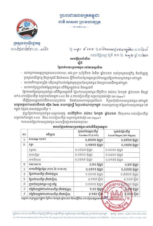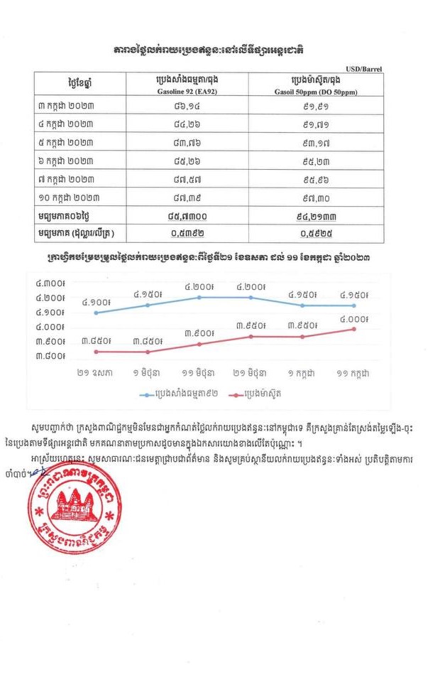 រាជធានីភ្នំពេញ៖ យោងតាមលិខិតរបស់ ក្រសួងពាណិជ្ជកម្ម ចុះផ្សាយថ្ងៃទី១១ ខែកក្កដា ឆ្នាំ២០២៣ ស្តីអំពីតម្លៃលក់រាយប្រេងឥន្ធនៈនៅតាមស្ថានីយទាំងអស់ក្នុងព្រះរាជាណាចក្រកម្ពុជាសម្រាប់អនុវត្តទៅតាមតម្លៃមធ្យមប្រេងឥន្ធនៈលើទីផ្សារអន្តរជាតិ ចាប់ពីថ្ងៃទី១១ ដល់ថ្ងៃទី២០ ខែកក្កដា ឆ្នាំ២០២៣ បានឲ្យដឹងថា តម្លៃប្រេងសាំងធម្មតាមានតម្លៃ ៤,១៥០រៀលក្នុងមួយលីត្រ ចំណែកឯប្រេងសាំងម៉ាស៊ូតមានតម្លៃ ៤,០០០រៀលក្នុងមួយលីត្រប៉ុណ្ណោះ។