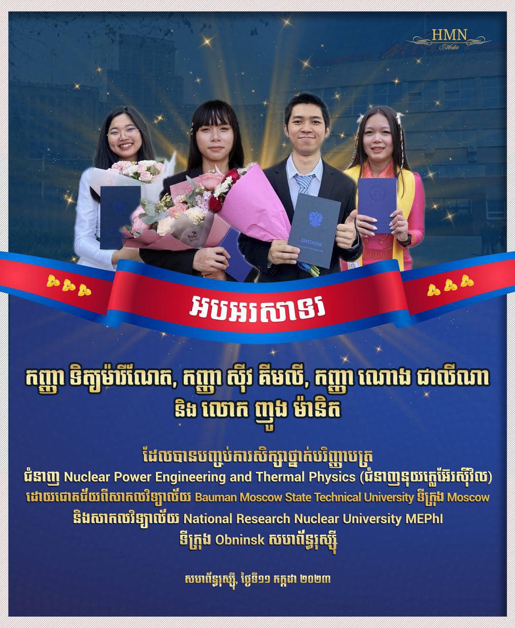 មជ្ឈមណ្ឌល CAM-ATOM បានសម្តែងនូវសេចក្តីរីករាយ និងអបអរសាទរជូនចំពោះកញ្ញា ទិត្យម៉ារីណែត កញ្ញា ស៊ីវ គីមលី កញ្ញា ណោង ជាលីណា និងលោក ញូង ម៉ានិត ដែលបានបញ្ចប់ការសិក្សាថ្នាក់បរិញ្ញាប័ត្រ ជំនាញ Nuclear Power Engineering and Thermal Physics (ជំនាញនុយក្លេអ៊ែរស៊ីវិល) ដោយជោគជ័យពីសាកលវិទ្យាល័យលំដាប់កំពូលទាំងពីរគឺ សាកលវិទ្យាល័យ Bauman Moscow State Technical University ទីក្រុង Moscow និងសាកលវិទ្យាល័យ National Research Nuclear University MEPhI ទីក្រុង Obninsk សហព័ន្ធរុស្ស៊ី។