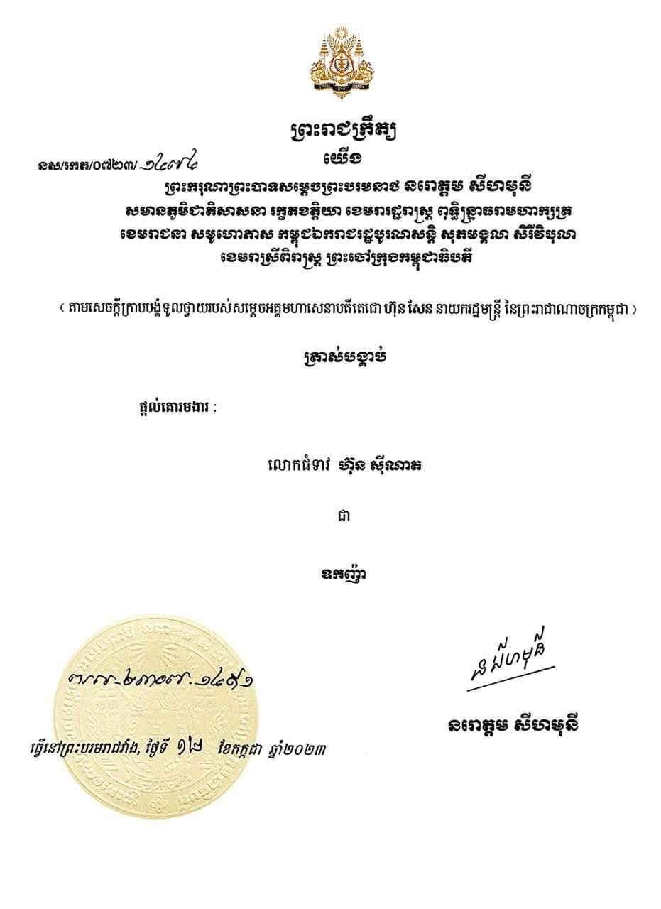 រាជធានីភ្នំពេញ៖ នៅថ្ងៃទី១៣ ខែកក្កដា ឆ្នាំ២០២៣ យោងតាមព្រះរាជក្រឹត្យ ព្រះករុណាព្រះបាទសម្ដេចព្រះបរមនាថ នរោត្តម សីហមុនី ព្រះមហាក្សត្រនៃព្រះរាជាណាចក្រកម្ពុជា បានចេញព្រះរាជក្រឹត្យត្រាស់បង្គាប់ផ្ដល់គោរមងារដល់លោកជំទាវ ហ៊ុន ស៊ីណាត ជា «ឧកញ៉ា»។