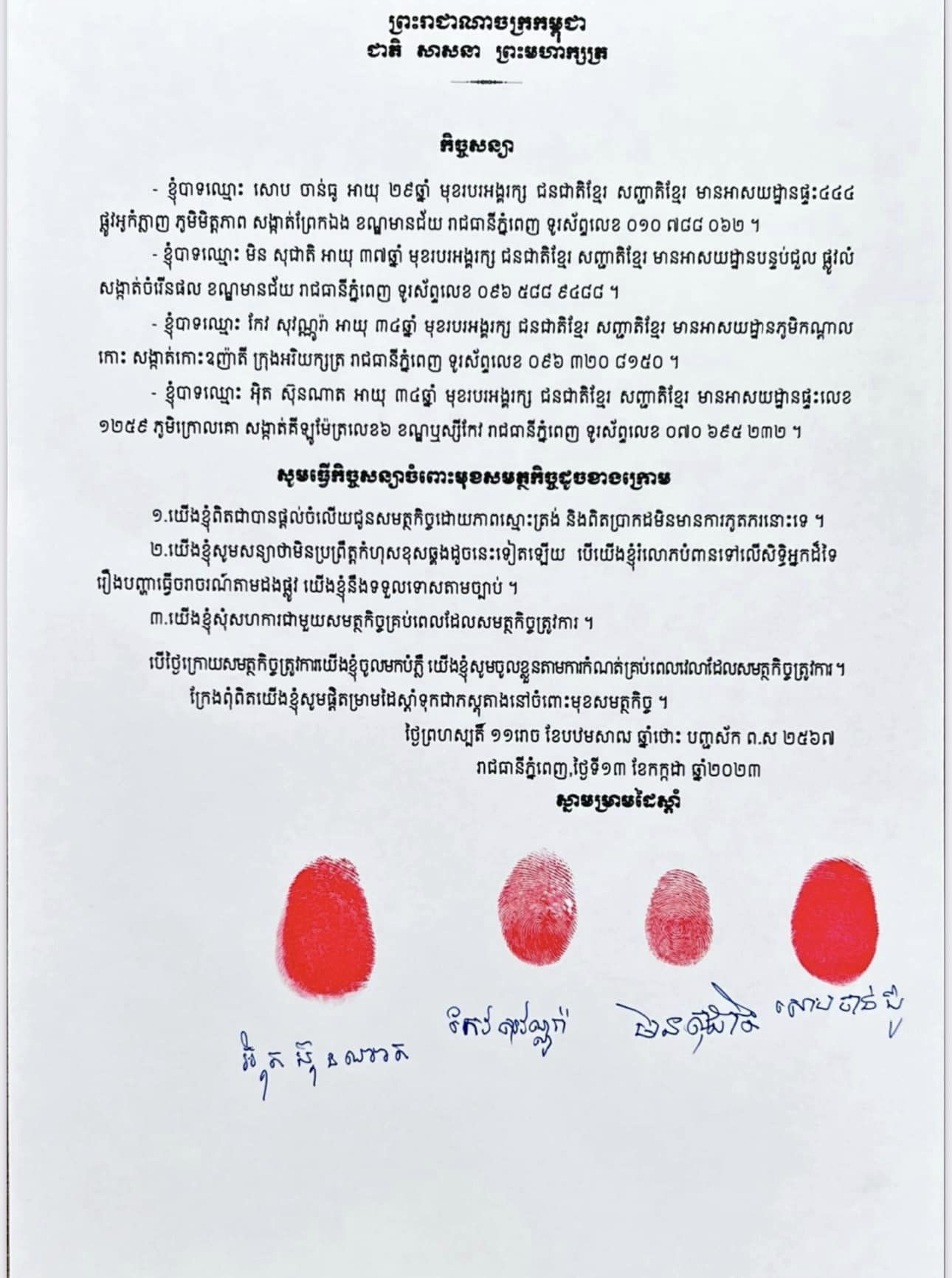 អង្គរក្សទាំង៤នាក់ បានលើកដៃសំពះ សូមទទួលស្គាល់កំហុស ខុសឆ្គងដែលទង្វើរបស់គាត់បានប្រព្រឹត្ត ធ្វើឱ្យប៉ះពាល់អារម្មណ៍ដល់សាធារណជននៅតាមដងផ្លូវ និងបងប្អូនប្រជាពលរដ្ឋខ្មែរ ជាពិសេសអ្នកដែលបានឃើញហេតុការណ៍ផ្ទាល់ និងក្នុងបណ្ដាញសង្គម សូមបងប្អូនប្រជាពលរដ្ឋ មានការយោគយល់ អធ្យាស្រ័យផង ហើយគាត់សន្យាថា កែប្រែខ្លួនធ្វើជាពលរដ្ឋល្អ បើអាចគឺគាត់ចង់ជួបបងប្រុស ដែលមានបញ្ហាលើដងផ្លូវកាលពីម្សិលមិញ ធ្វើការសុំទោសដោយផ្ទាល់ផងដែរ ៕