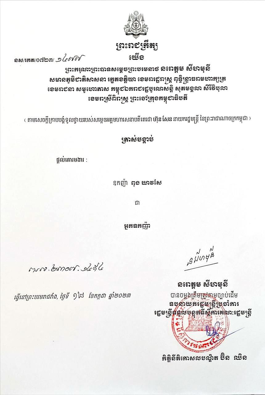 រាជធានីភ្នំពេញ៖ នៅថ្ងៃទី១៧ ខែកក្កដា ឆ្នាំ២០២៣ យោងតាមព្រះរាជក្រឹត្យ ព្រះករុណាព្រះបាទសម្ដេចព្រះបរមនាថ នរោត្តម សីហមុនី ព្រះមហាក្សត្រនៃព្រះរាជាណាចក្រកម្ពុជា បានចេញព្រះរាជក្រឹត្យត្រាស់បង្គាប់ផ្ដល់គោរមងារដល់ឧកញ៉ា ពុង ឃាវសែ ជា «អ្នកឧកញ៉ា»។