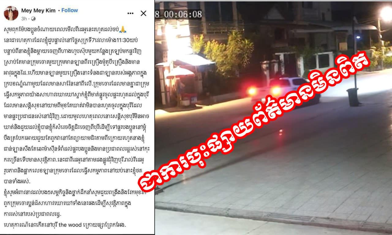 ស្នងការដ្ឋាននគរបាលរាជធានីភ្នំពេញ សូមធ្វើការបញ្ជាក់ថាការចុះផ្សាយវីដេអូនៅលើបណ្ដាញសង្គមរបស់គណនីហ្វេសប៊ុកឈ្មោះ Mey Mey Kim ថាមានករណីដេញប្លន់ដល់ក្នុងបូរី ក្រោយផ្សារព្រែកឯង កាលពីយប់ថ្ងៃសុក្រ ទី០៧ ខែកក្កដា ឆ្នាំ២០២៣ វេលាម៉ោង១១៖២០យប់ ជាការចុះផ្សាយព័ត៌មានមិនពិត ជាក់ស្តែងស្ត្រីខាងលើជាប់ពាក់ព័ន្ធនឹងករណីពាក្យបណ្តឹងអំពើលួច (ប្រាក់) ដែលចេញដោយព្រះរាជអាជ្ញា នៃអយ្យការអមសាលាដំបូងខេត្តកណ្តាល ចេញដីការបញ្ជាឲ្យចូលខ្លួន តែរហូតមកដល់ពេលនេះស្ត្រីរូបនោះ បានរត់គេចខ្លួន ដោយមិនបានចូលខ្លួនតាមការបញ្ជារបស់ព្រះរាជអាជ្ញាអមសាលាដំបូងខេត្តកណ្តាលនោះឡើយ ៕