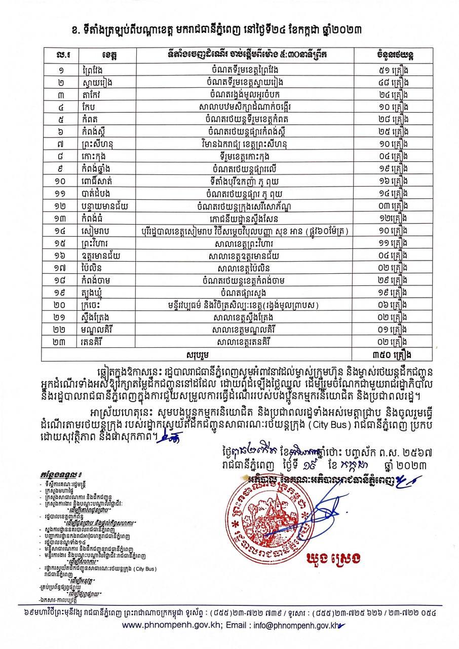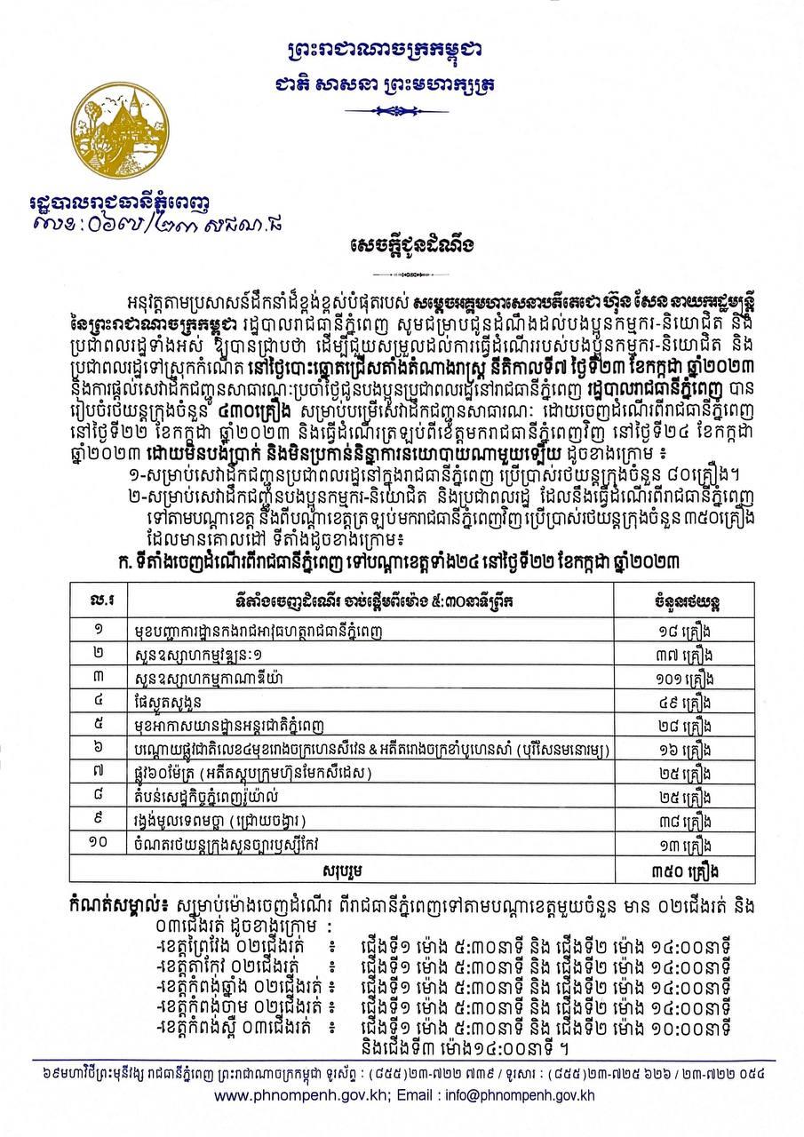 ដើម្បីជួយសម្រួលដល់ការធ្វើដំណើររបស់បងប្អូនកម្មករ-និយោជិត និងប្រជាពលរដ្ឋទៅស្រុកកំណើត នៅថ្ងៃបោះឆ្នោតជ្រើសតាំងតំណាងរាស្ត្រ នីតិកាលទី៧ ថ្ងៃទី២៣ ខែកក្កដា ឆ្នាំ២០២៣ នឹងការផ្តល់សេវាដឹកជញ្ជូនសាធារណៈប្រចាំថ្ងៃជូនបងប្អូនប្រជាពលរដ្ឋនៅរាជធានីភ្នំពេញ រដ្ឋបាលរាជធានីភ្នំពេញ បានរៀបចំរថយន្តក្រុងចំនួន ៤៣០គ្រឿង សម្រាប់បម្រើសេវាដឹកជញ្ជូនសាធារណៈ ដោយចេញដំណើរពីរាជធានីភ្នំពេញ នៅថ្ងៃទី២២ ខែកក្កដា ឆ្នាំ២០២៣ និងធ្វើដំណើរត្រឡប់ពីខេត្តមករាជធានីភ្នំពេញវិញ នៅថ្ងៃទី២៤ ខែកក្កដា ឆ្នាំ២០២៣ ដោយមិនបង់ប្រាក់ និងមិនប្រកាន់និន្នាការនយោបាយណាមួយឡើយដូចខាងក្រោម៖