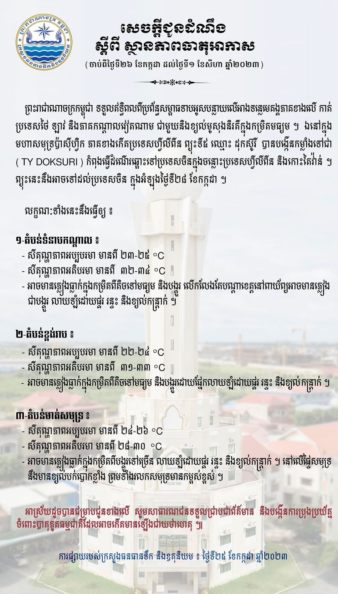 រាជធានីភ្នំពេញ៖ នៅថ្ងៃទី២៥ ខែកក្កដា ឆ្នាំ២០២៣ យោងតាមការចុះផ្សាយរបស់ ក្រសួងធនធានទឹក និងឧតុនិយម បានចេញសេចក្ដីជូនដំណឹង ស្ដីពីស្ថានភាពធាតុអាកាស ចាប់ពីថ្ងៃទី២៦ ខែកក្កដា ដល់ថ្ងៃទី០១ ខែសីហា ឆ្នាំ២០២៣។