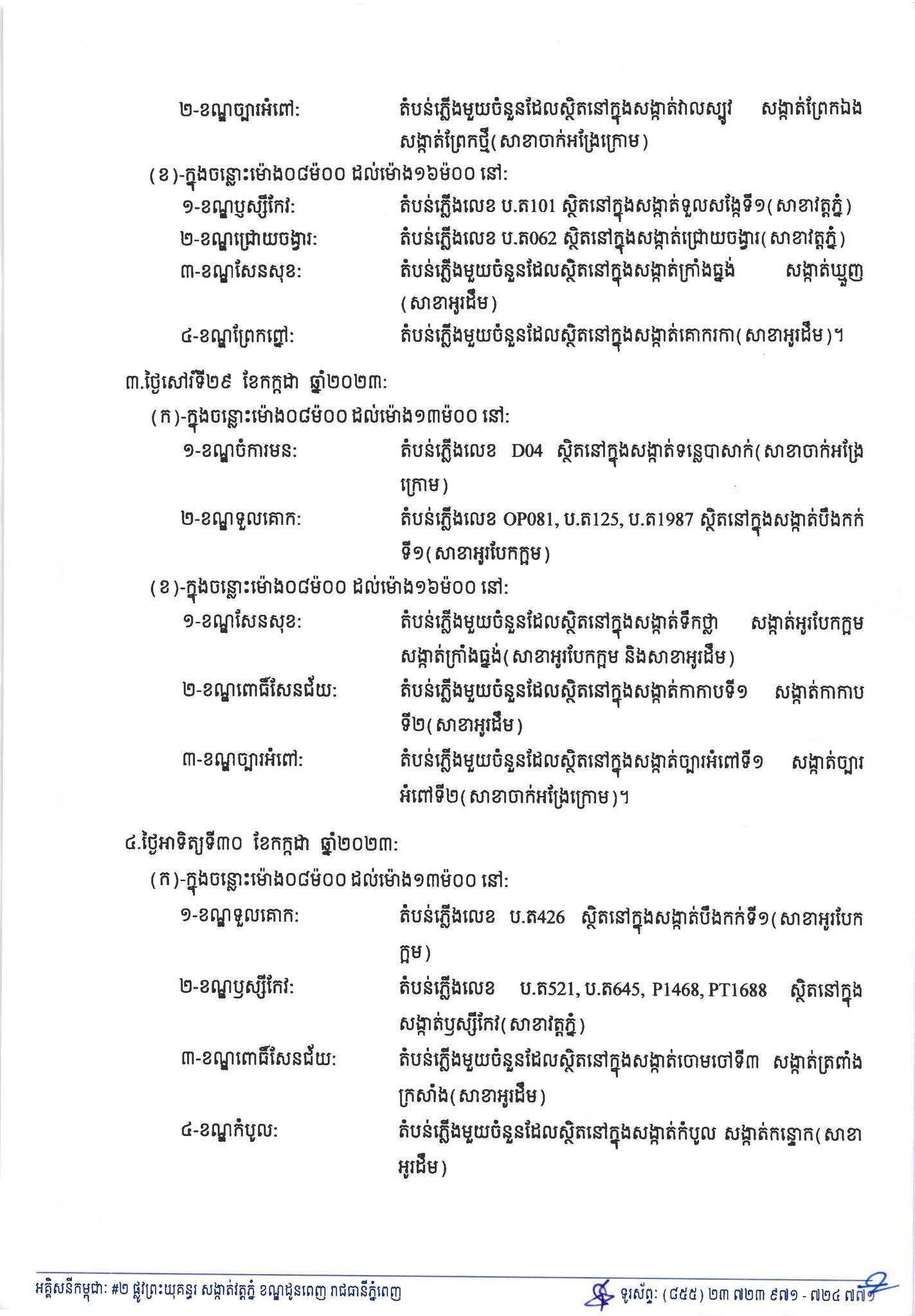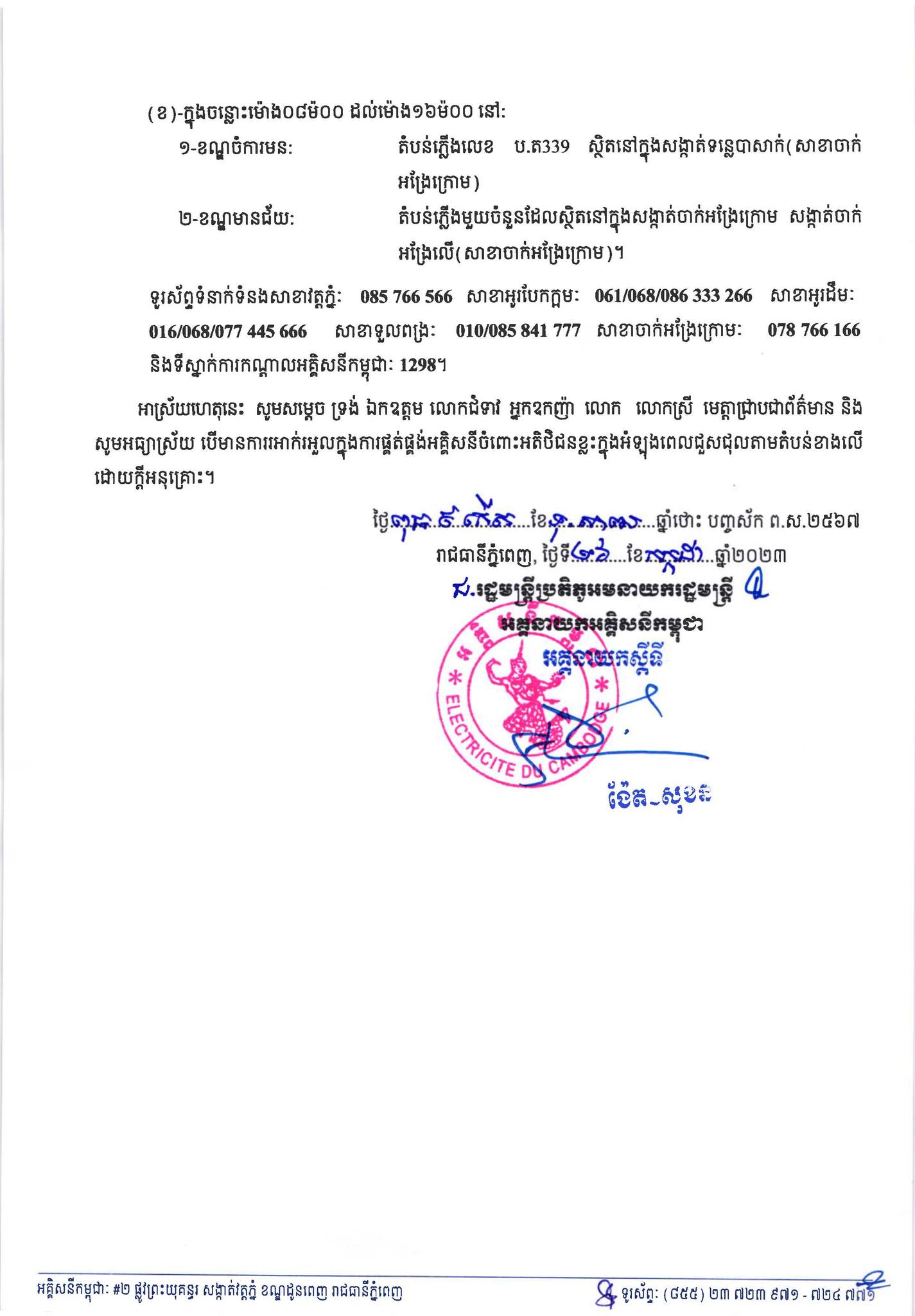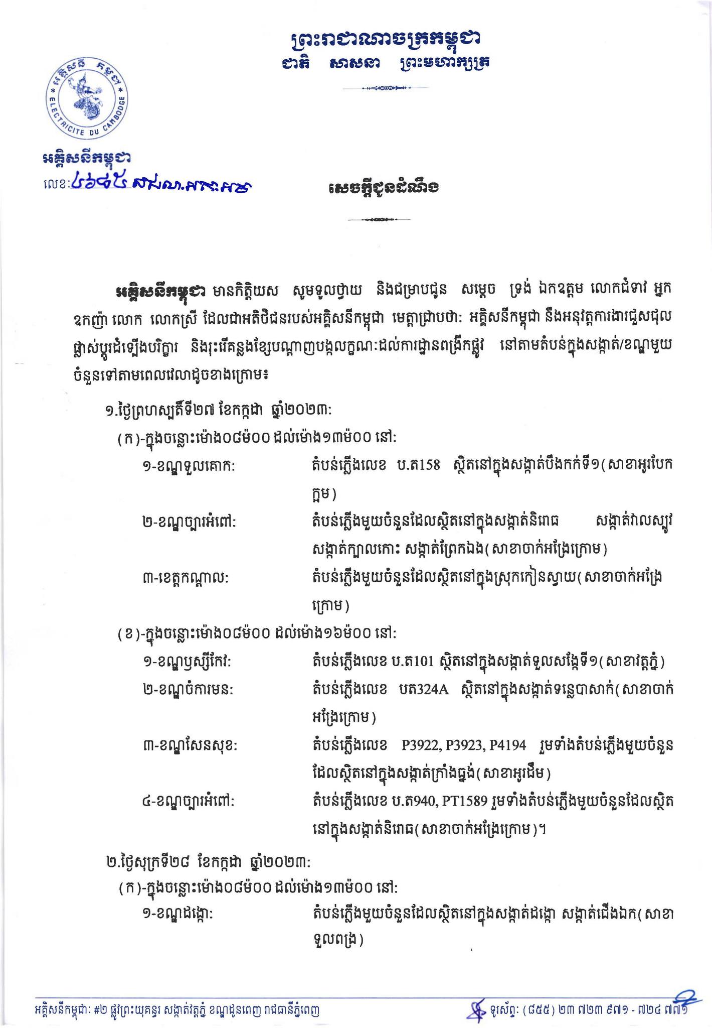 រាជធានីភំ្នពេញ៖ នៅថ្ងៃពុធ ៩កើត ខែទុតិយាសាឍ ឆ្នាំថោះ បញ្ចស័ក ព.ស.២៥៦៧ ត្រូវនឹងថ្ងៃទី២៦ ខែកក្កដា ឆ្នាំ២០២៣ យោងតាមការចុះផ្សាយរបស់ អគ្គិសនីកម្ពុជា បានចេញសេចក្ដីជូនដំណឹង ស្តីពីការអនុវត្តការងារជួសជុល ផ្លាស់ប្តូរតម្លើងបរិក្ខារនានា និងរុះរើគន្លងខ្សែបណ្តាញអគ្គិសនីរបស់អគ្គិសនីកម្ពុជា ដើម្បីបង្កលក្ខណៈងាយស្រួលដល់ការដ្ឋានពង្រីកផ្លូវ នៅថ្ងៃទី២៧ ខែកក្កដា ឆ្នាំ២០២៣ ដល់ថ្ងៃទី៣០ ខែកក្កដា ឆ្នាំ២០២៣ នៅតំបន់មួយចំនួនទៅតាមពេលវេលា និងទីកន្លែងដូចសេចក្តីជូនដំណឹងលម្អិតខាងក្រោម។