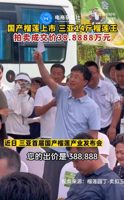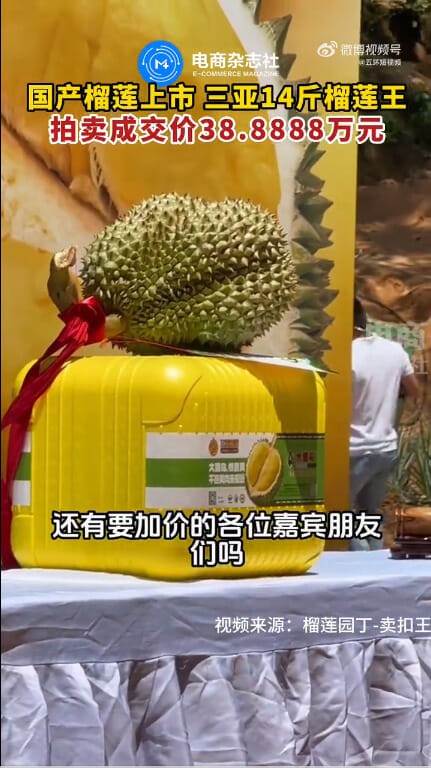 ទុរេនមួយផ្លែដែលជាទុរេនដំបូងបំផុតដាំបាននៅក្នុងប្រទេសចិនត្រូវបានដាក់លក់ក្នុងតម្លៃរហូតដល់ជាង ៥ម៉ឺនដុល្លារ