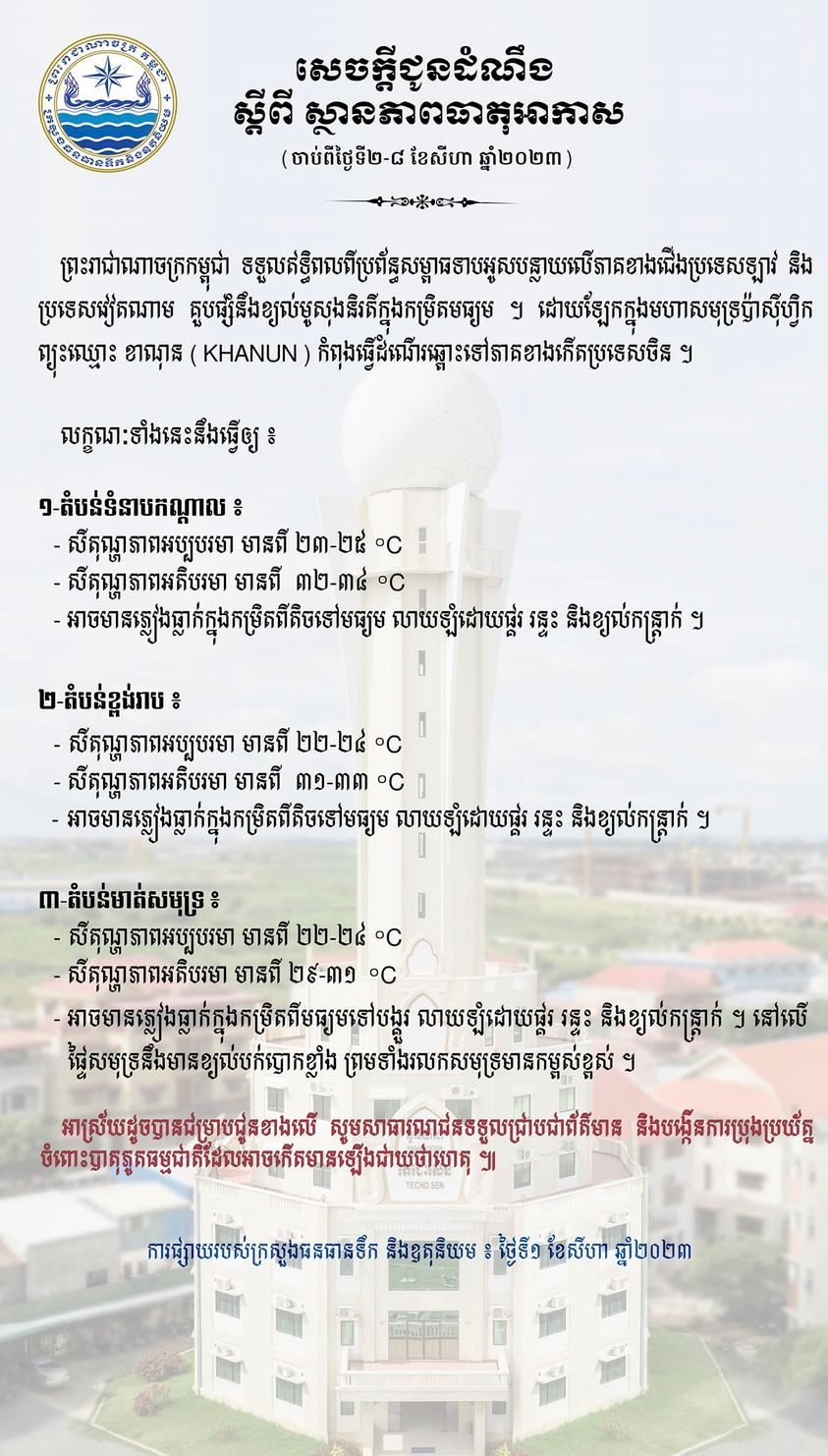 រាជធានីភ្នំពេញ៖ នៅថ្ងៃទី០១ ខែសីហា ឆ្នាំ២០២៣ យោងតាមការចុះផ្សាយរបស់ ក្រសួងធនធានទឹក និងឧតុនិយម បានចេញសេចក្ដីជូនដំណឹង ស្ដីពី ស្ថានភាពធាតុអាកាស ចាប់ពីថ្ងៃទី០២ ដល់ថ្ងៃទី០៨ ខែសីហា ឆ្នាំ២០២៣។