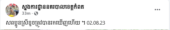 លោកឧត្តមសេនីយ៍ទោ ម៉ៅ ច័ន្ទមធុរិទ្ធ បានសរសេររៀបរាប់ថា៖ «សពប្អូនស្រីខួចត្រូវបានរកឃើញហើយនៅថ្ងៃទី០២ ខែសីហា ឆ្នាំ២០២៣»។ ក្រោយប្រើពេលរុករកអស់រយៈពេល៤ថ្ងៃ នៅពេលនេះសពនារីរងគ្រោះ ត្រូវបានកម្លាំងសមត្ថកិច្ចរកឃើញហើយ នៅចម្ងាយពីកន្លែងកើតហេតុប្រមាណជាង២០០ម៉ែត្រ។