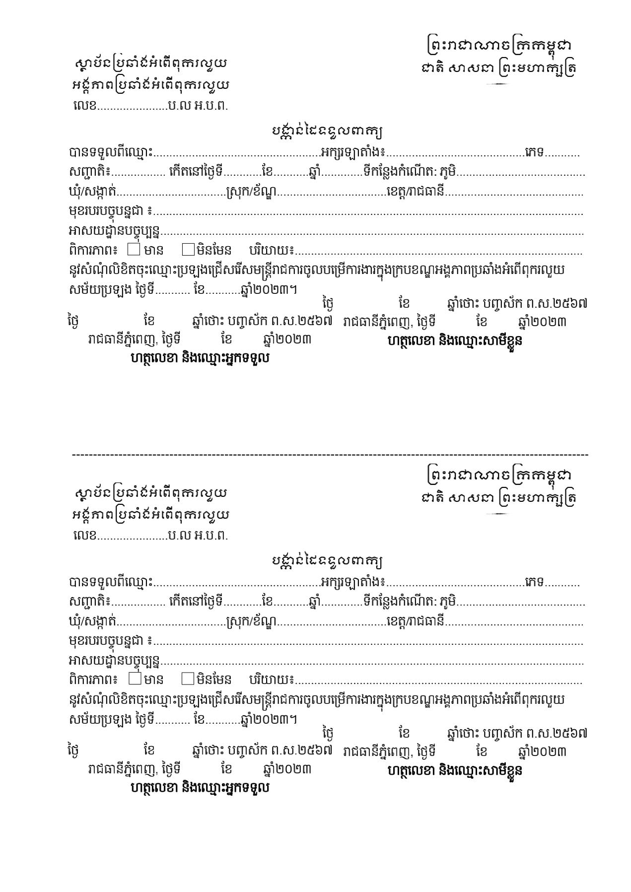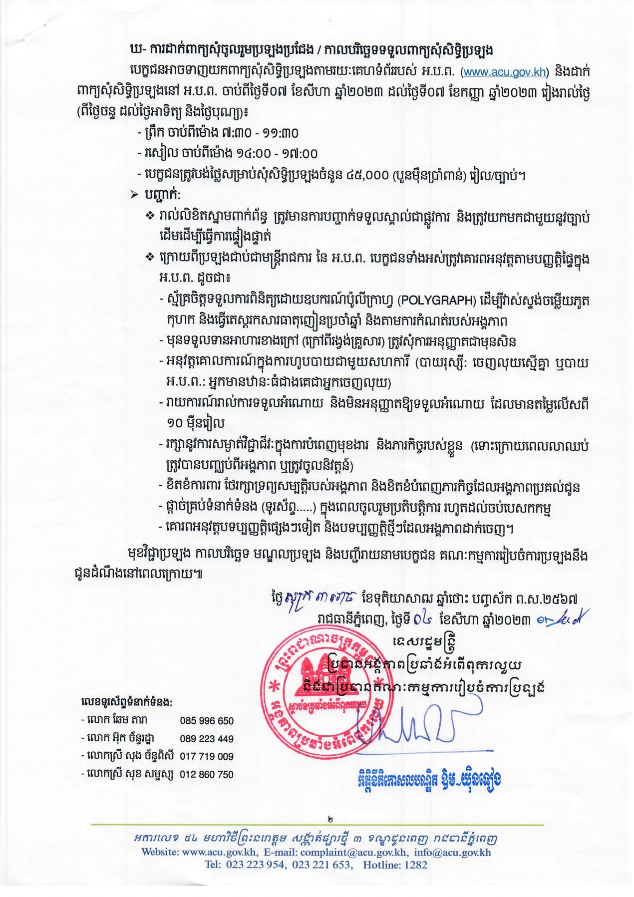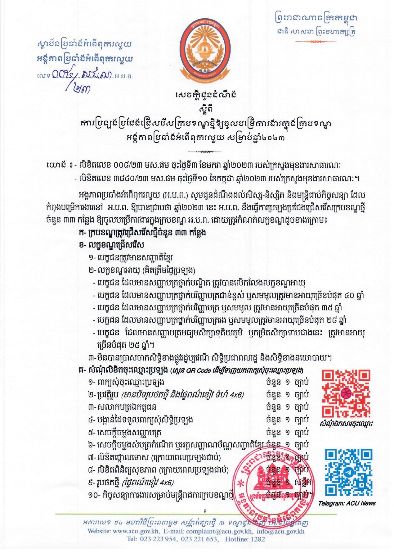 អង្គភាពប្រឆាំងអំពើពុករលួយ (អ.ប.ព.) សូមជូនដំណឹងដល់សិស្ស-និស្សិត និងមន្ត្រីជាប់កិច្ចសន្យា ដែល កំពុងបម្រើការងារនៅ អ.ប.ព. ឱ្យបានជ្រាបថា ឆ្នាំ២០២៣នេះ អ.ប.ព. នឹងធ្វើការប្រឡងប្រជែងជ្រើសរើសក្របខណ្ឌថ្មី ចំនួន ៣៣កន្លែង ឱ្យចូលបម្រើការងារក្នុងក្របខណ្ឌ អ.ប.ព. ដោយត្រូវកំណត់លក្ខខណ្ឌដូចខាងក្រោម៖