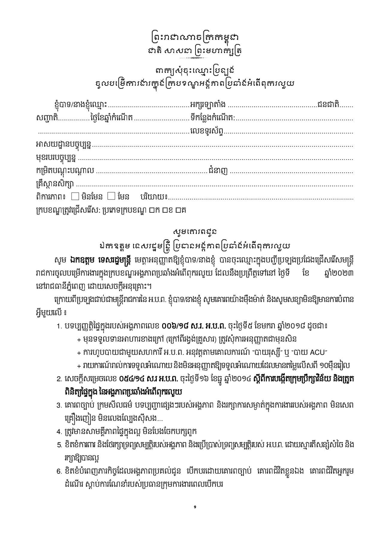 ឱកាសល្អ! អង្គភាពប្រឆាំងអំពើពុករលួយ ជ្រើសរើសមន្ត្រីក្របខណ្ឌថ្មីចំនួន ៣៣រូប ផុតកំណត់នៅថ្ងៃទី៧ ខែកញ្ញា