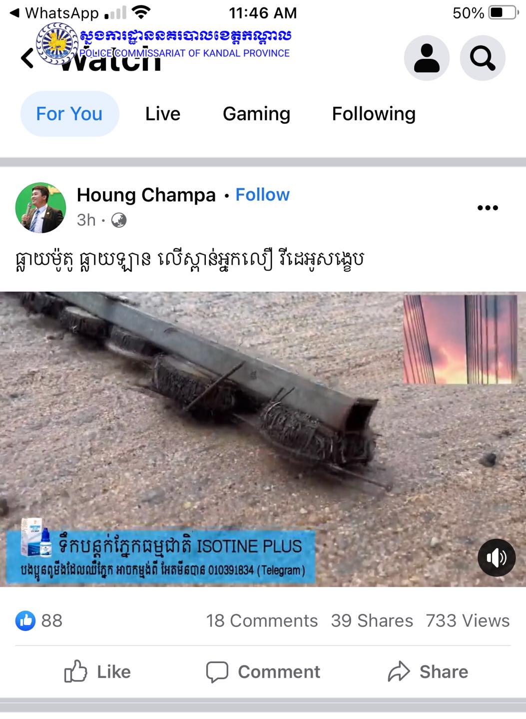 ខេត្តកណ្ដាល៖ យោងតាមការចុះផ្សាយរបស់ ស្នងការដ្ឋាននគរបាលខេត្តកណ្តាល បានចេញបំភ្លឺឆ្លើយតបទៅនិងគណនីហ្វេសប៊ុកឈ្មោះ Houng Champa បានបង្ហោះវីដេអូមានខ្លឹមសារថា៖ «ធ្លាយម៉ូតូ ធ្លាយឡានលើស្ពានអ្នកលឿង វីដេអូសង្ខេបសម្រាប់ឆក់ដែកគោល វីស ដែកកាំកង់លើស្ពានអ្នកលឿង។»