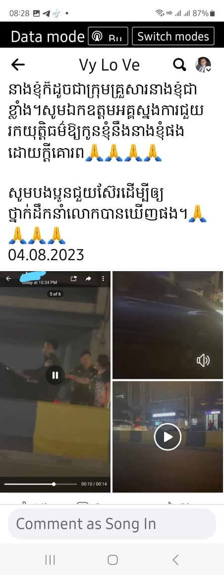នាងខ្ញុំសូមស្នើរដល់ ឯកឧត្តមអគ្គស្នងការនគរបាលជាតិ ជួយរកយុត្តិធម៌ឲ្យកូនស្រីនឹងរូបនាងខ្ញុំផង នៅវេលាម៉ោងប្រហែល 10:30នាទីយប់ នៅមុខអាគារព្រីនជិតអគ្គស្នងការដែលមានកម្លាំងប្រដាប់អាវុធមួយក្រុមប្រហែលជាពីរទៅបីឡានបានកាក់ឡាននាងខ្ញុំនៅមុខអាគារព្រីន ហើយបានយកកាំភ្លើងខ្លីមកភ្ជង់ក្បាលកូនស្រីខ្ញុំនិងនាងខ្ញុំដោយមិនដឹងមូលហេតុ ហើយបានស្រែកបង្ខំអោយខ្ញុំឡើងឡានចូលទៅអគ្គស្នងការ ដល់ពេលនាងខ្ញុំសួររកហេតុផលថានាងខ្ញុំខុសអ្វី បែរជាមិនប្រាប់នាងខ្ញុំហើយនាំគ្នាឡើងឡានទៅបាត់ នេះជាទង្វើដែលធ្វើឲ្យប៉ះពាល់ដល់កិត្តិយសនាងខ្ញុំក៏ដូចជាក្រុមគ្រួសារនាងខ្ញុំជាខ្លាំង។ សូម ឯកឧត្តម អគ្គស្នងការជួយរកយុត្តិធម៌ឱ្យកូនខ្ញុំនឹងនាងខ្ញុំផង ដោយក្តីគោរព។