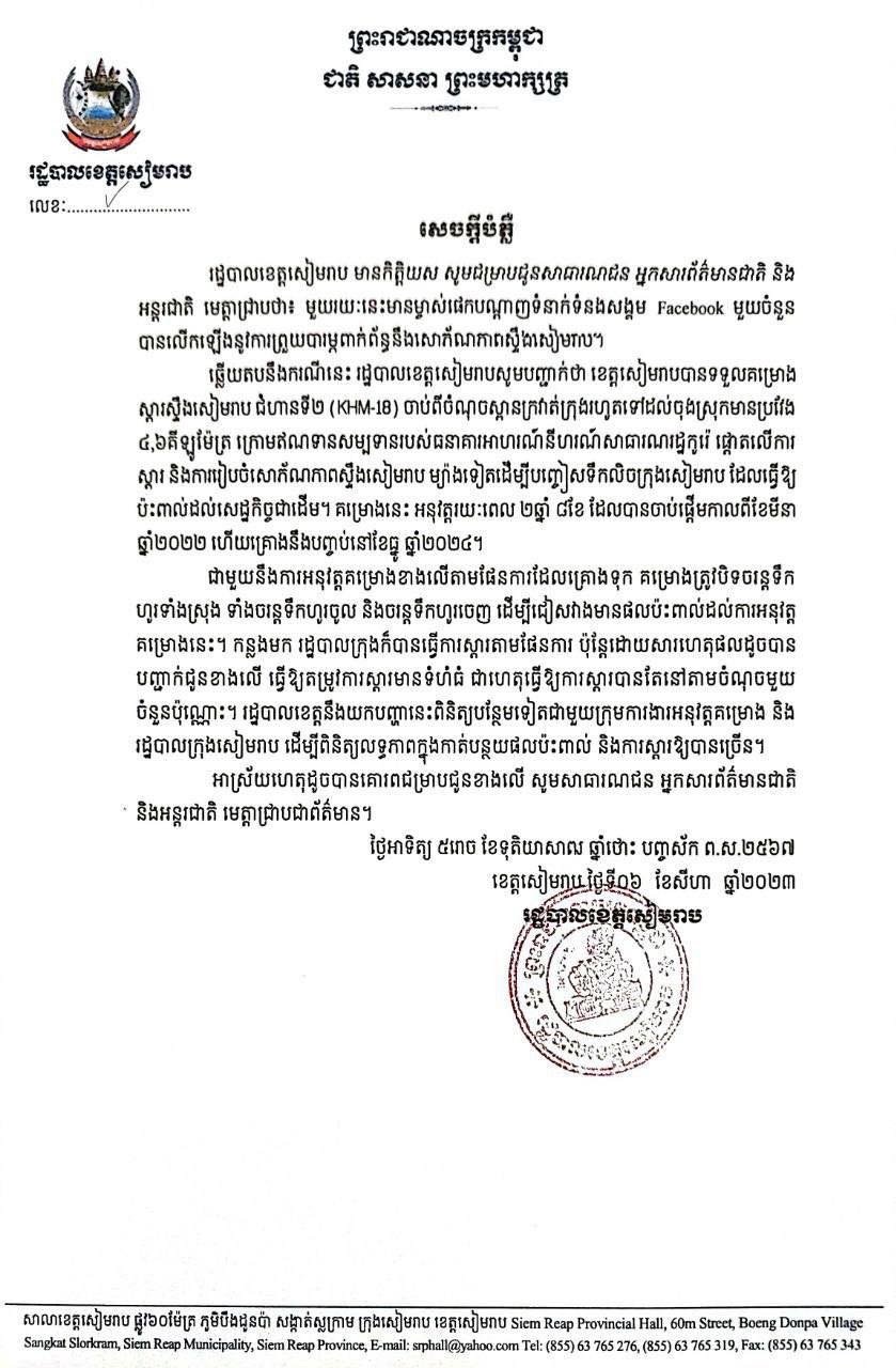 រដ្ឋបាលខេត្តនឹងយកបញ្ហានេះពិនិត្យបន្ថែមទៀតជាមួយក្រុមការងារអនុវត្តគម្រោង និង រដ្ឋបាលក្រុងសៀមរាប ដើម្បីពិនិត្យលទ្ធភាពក្នុងកាត់បន្ថយផលប៉ះពាល់ និងការស្ដារឱ្យបានច្រើន។ អាស្រ័យហេតុដូចបានគោរពជម្រាបជូនខាងលើ សូមសាធារណជន អ្នកសារព័ត៌មានជាតិ និងអន្តរជាតិ មេត្តាជ្រាបជាព័ត៌មាន ៕