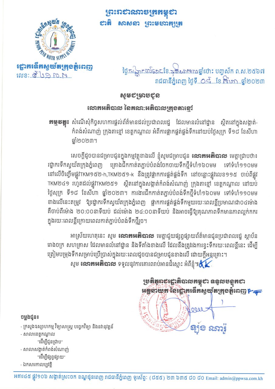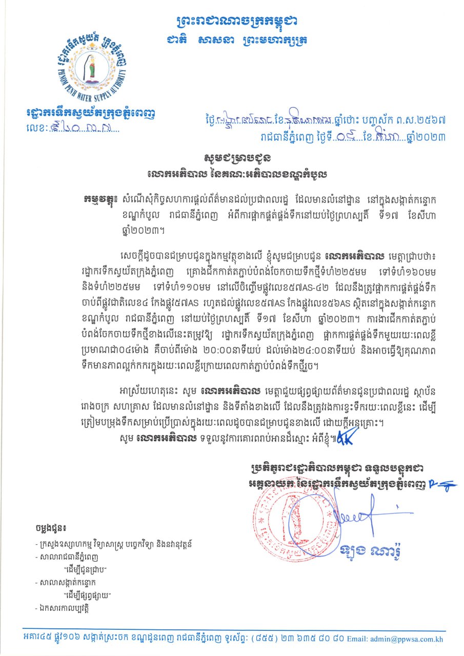 អាស្រ័យហេតុនេះ សូម លោកអភិបាល មេត្តាជួយផ្សព្វផ្សាយព័ត៌មានជូនប្រជាពលរដ្ឋ ស្ថាប័ន រោងចក្រ សហគ្រាស ដែលមានលំនៅដ្ឋាន និងទីតាំងខាងលើ ដែលនឹងត្រូវរងការខ្វះទឹករយៈពេលខ្លីនេះ ដើម្បី ត្រៀមបម្រុងទឹកសម្រាប់ប្រើប្រាស់ក្នុងរយៈពេលដូចបានជម្រាបជូនខាងលើ ដោយក្តីអនុគ្រោះ ៕