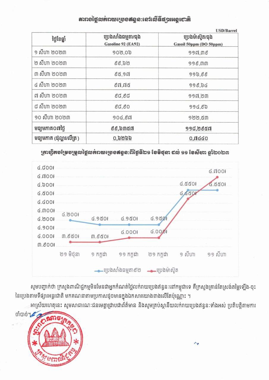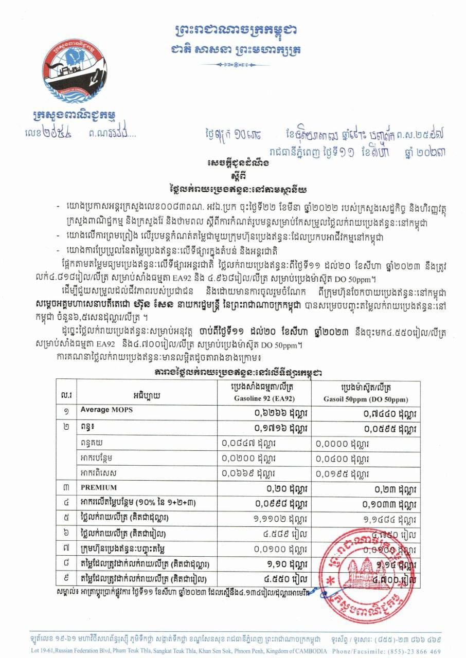 រាជធានីភ្នំពេញ៖ យោងតាមលិខិតរបស់ ក្រសួងពាណិជ្ជកម្ម ចុះផ្សាយថ្ងៃទី១១ ខែសីហា ឆ្នាំ២០២៣ ស្តីអំពីតម្លៃលក់រាយប្រេងឥន្ធនៈនៅតាមស្ថានីយទាំងអស់ក្នុងព្រះរាជាណាចក្រកម្ពុជាសម្រាប់អនុវត្តទៅតាមតម្លៃមធ្យមប្រេងឥន្ធនៈលើទីផ្សារអន្តរជាតិ ចាប់ពីថ្ងៃទី១១ ដល់ថ្ងៃទី២០ ខែសីហា ឆ្នាំ២០២៣ បានឲ្យដឹងថា តម្លៃប្រេងសាំងធម្មតាមានតម្លៃ ៤,៥៥០រៀលក្នុងមួយលីត្រ ចំណែកឯប្រេងសាំងម៉ាស៊ូតមានតម្លៃ ៤,៧០០រៀលក្នុងមួយលីត្រប៉ុណ្ណោះ។