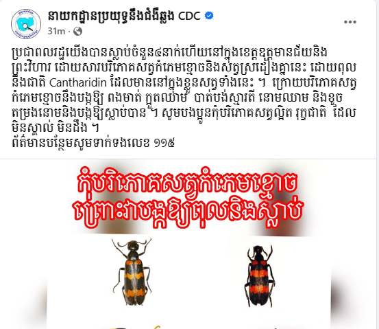 រាជធានីភ្នំពេញ៖ នៅថ្ងៃទី១១ ខែសីហា ឆ្នាំ២០២៣ យោងតាមការចុះផ្សាយរបស់ នាយកដ្ឋានប្រយុទ្ធនឹងជំងឺឆ្លង CDC បានឱ្យដឹងថា ប្រជាពលរដ្ឋបានបាត់បង់ជីវិតចំនួន ៤នាក់ហើយ នៅក្នុងខេត្តឧត្តមានជ័យនិងព្រះវិហារ ដោយសារបរិភោគសត្វកំភេមខ្មោចនិងសត្វស្រដៀងគ្នានេះ ដោយពុលនឹងជាតិ Cantharidin ដែលមាននៅក្នុងខ្លួនសត្វទាំងនេះ។