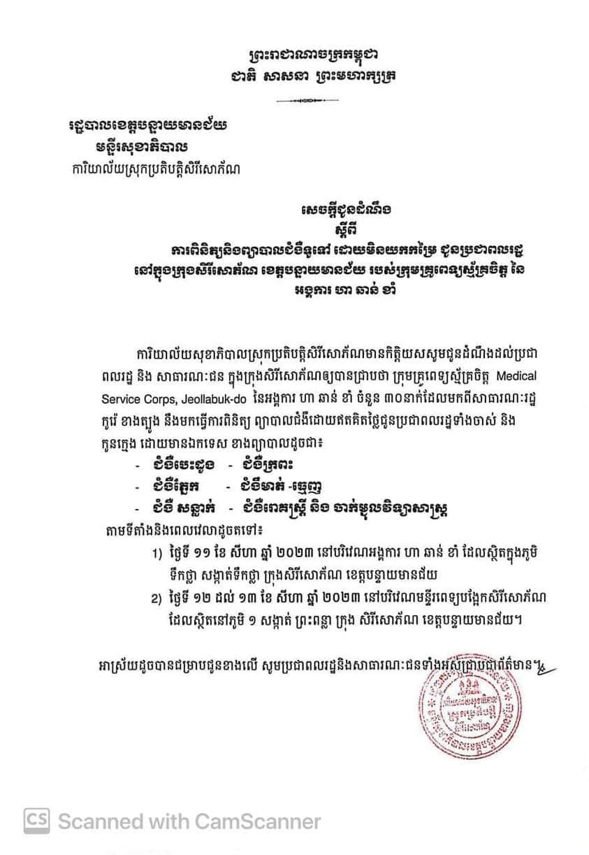 ការិយាល័យសុខាភិបាលស្រុកប្រតិបត្តិសិរីសោភ័ណ មានកិត្តិយសសូមជូនដំណឹងដល់ប្រជាពលរដ្ឋ និង សាធារណៈជន ក្នុងក្រុងសិរីសោភ័ណឲ្យបានជ្រាបថា ក្រុមគ្រូពេទ្យស្ម័គ្រចិត្ត Medical Service Corps, Jeollabuk-do នៃអង្គការ ហា ឆាន់ ខាំ ចំនួន ៣០នាក់ដែលមកពីសាធារណៈរដ្ឋ កូរ៉េ ខាងត្បូង នឹងមកធ្វើការពិនិត្យ ព្យាបាលជំងឺដោយឥតគិតថ្លៃជូនប្រជាពលរដ្ឋទាំងចាស់ និង កូនក្មេង ដោយមានឯកទេស ខាងព្យាបាលដូចជា៖ ជំងឺបេះដូង, ជំងឺក្រពះ, ជំងឺមាត់-ធ្មេញ, ជំងឺភ្នែក, ជំងឺសន្លាក់, ជំងឺរោគស្ត្រី និង ចាក់ម្ជុលវិទ្យាសាស្ត្រ ។