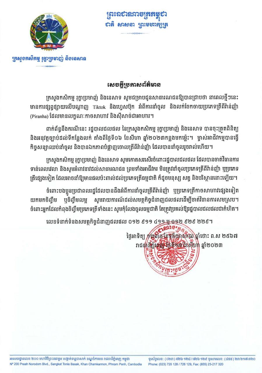 ក្រសួងកសិកម្ម បានឱ្យដឹងថា នាពេលថ្មីៗនេះមានការផ្សព្វផ្សាយលើបណ្តាញ Tiktok និងហ្វេសប៊ុក អំពីការនាំចូល និងលក់ចែកចាយប្រភេទត្រីពីរ៉ាន់ញ៉ា (Piranha) ដែលមានលក្ខណៈកាចសាហាវ និងស៊ីសាច់ជាអាហារ។ ពាក់ព័ន្ធនឹងករណីនេះ រដ្ឋបាលជលផល នៃក្រសួងកសិកម្ម រុក្ខាប្រមាញ់ និងនេសាទ បានចុះត្រួតពិនិត្យ និងអនុវត្តច្បាប់ដល់ទីកន្លែងលក់ តាំងពីថ្ងៃទី០៦ ខែសីហា ឆ្នាំ២០២៣កន្លងមកម្ល៉េះ។ ម្ចាស់អាជីវកម្មបានធ្វើកិច្ចសន្យាឈប់នាំចូល និងបានឯកភាពបំផ្លាញចោលតីពីរ៉ាន់ញ៉ា ដែលបាននាំចូលរួចរាល់ហើយ។