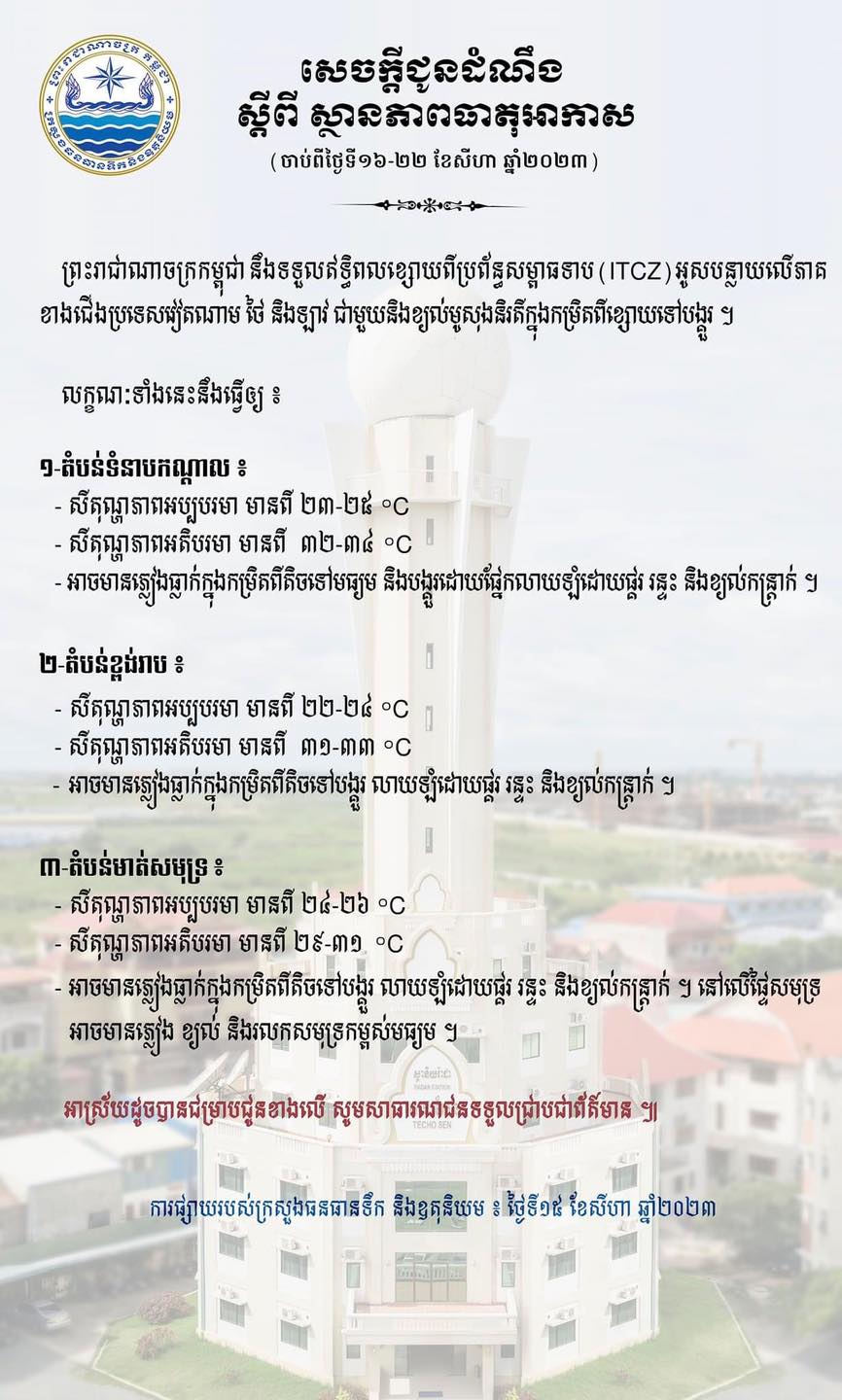 រាជធានីភ្នំពេញ៖​ នៅថ្ងៃទី១៥​ ខែសីហា ឆ្នាំ២០២៣ យោងតាមការចុះផ្សាយរបស់ ក្រសួងធនធានទឹក និងឧតុនិយម បានចេញសេចក្ដីជូនដំណឹង ស្ដីពីស្ថានភាពធាតុអាកាស ចាប់ពីថ្ងៃទី១៦ ដល់ថ្ងៃទី២២ ខែសីហា ឆ្នាំ២០២៣។