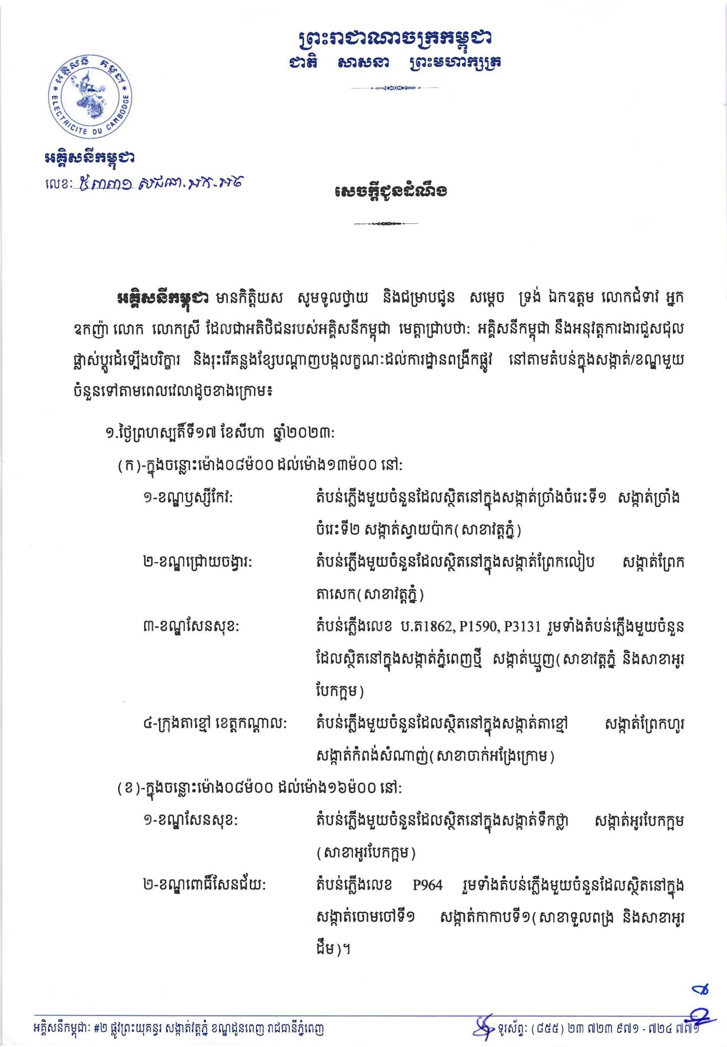 រាជធានីភំ្នពេញ​៖ នៅថ្ងៃពុធ ១៤រោច ខែទុតិយាសាឍ ឆ្នាំថោះ បញ្ចស័ក ព.ស.២៥៦៧ ត្រូវនឹងថ្ងៃទី១៦ ខែសីហា ឆ្នាំ២០២៣ អគ្គិសនីកម្ពុជា បានចេញសេចក្តីជូនដំណឹងស្តីពីការអនុវត្តការងារជួសជុល ផ្លាស់ប្តូរតម្លើងបរិក្ខារនានា និងរុះរើគន្លងខ្សែបណ្តាញអគ្គិសនីរបស់អគ្គិសនីកម្ពុជា ដើម្បីបង្កលក្ខណៈងាយស្រួលដល់ការដ្ឋានពង្រីកផ្លូវ នៅថ្ងៃទី១៧ ខែសីហា ឆ្នាំ២០២៣ ដល់ថ្ងៃទី២០ ខែសីហា ឆ្នាំ២០២៣ នៅតំបន់មួយចំនួនទៅតាមពេលវេលា និងទីកន្លែងដូចសេចក្តីជូនដំណឹងលម្អិតខាងក្រោម។
