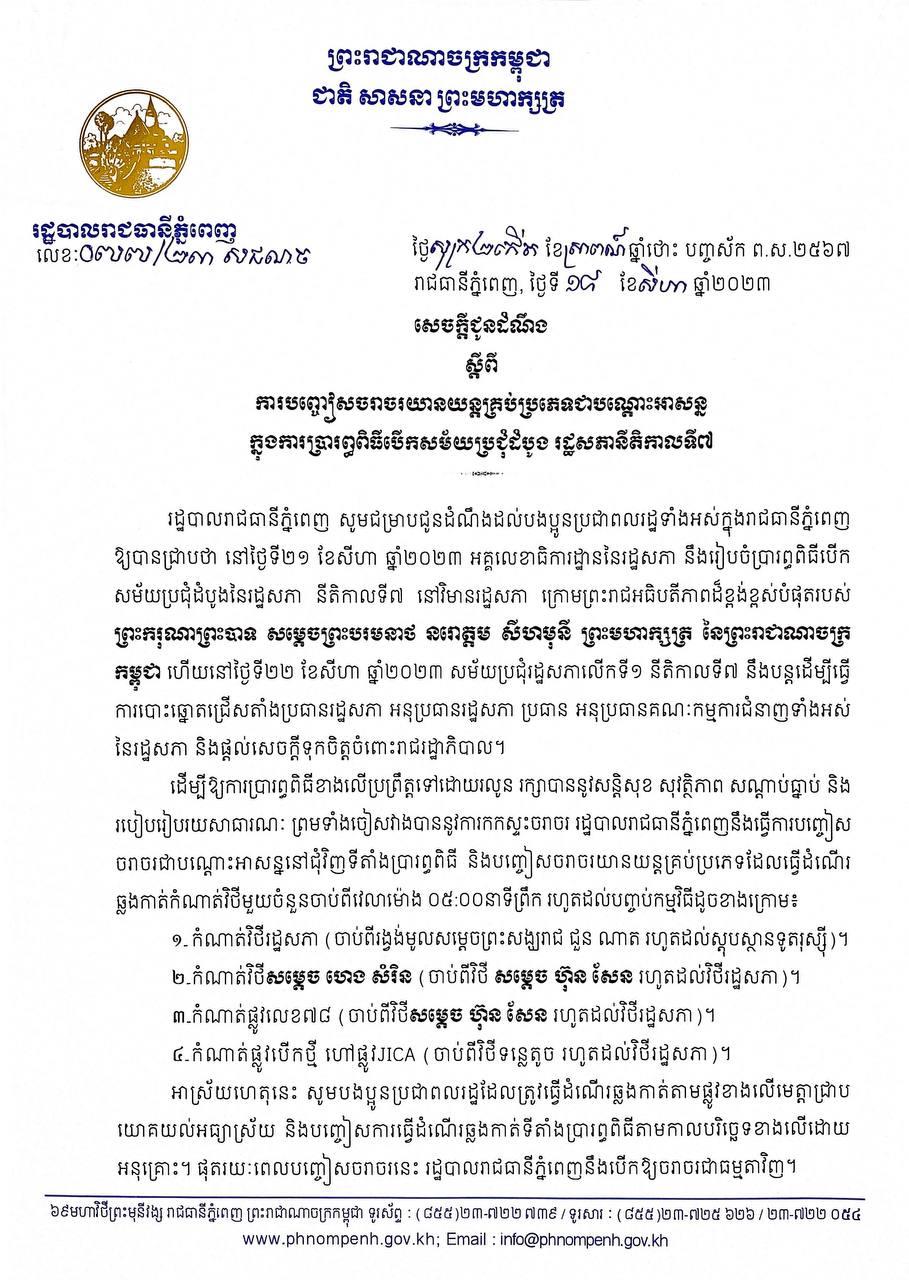 រាជធានីភ្នំពេញ៖ នៅថ្ងៃទី១៨ ខែសីហា ឆ្នាំ២០២៣ យោងតាមការចុះផ្សាយរបស់ រដ្ឋបាលរាជធានីភ្នំពេញ បានចេញសេចក្តីជូនដំណឹង ស្តីពីការបញ្ចៀសចរាចរយានយន្តគ្រប់ប្រភេទជាបណ្តោះអាសន្ន ក្នុងការប្រារព្ធពិធីបើកសម័យប្រជុំដំបូង រដ្ឋសភា នីតិកាលទី៧។