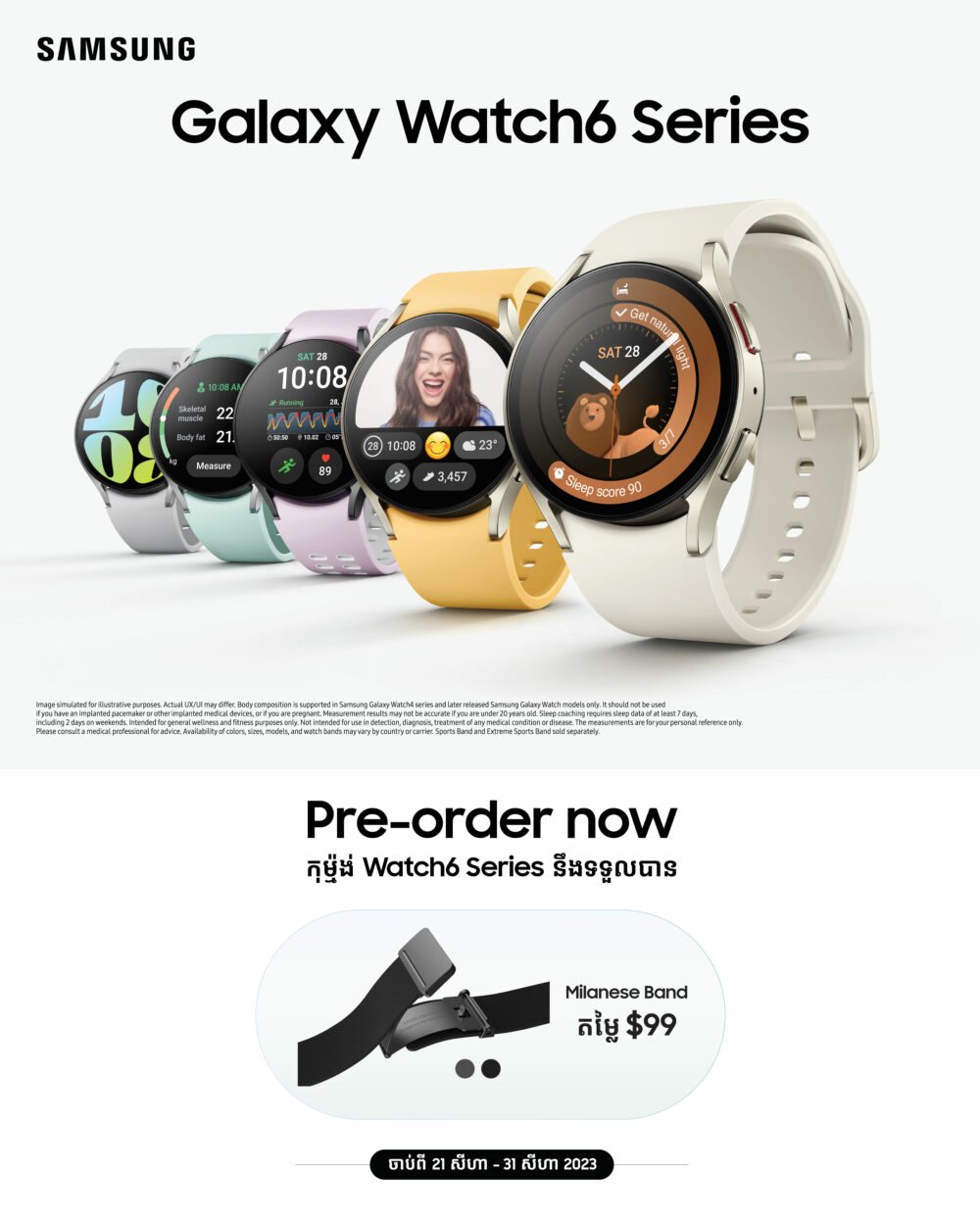 (ភ្នំពេញ) ថ្ងៃទី ២១ ខែសីហា ឆ្នាំ ២០២៣៖ ឱកាសពិសេសបានមកដល់ហើយ…! កំពូលនាឡិកាដៃ Samsung Galaxy Watch6 Series ស្អាត…ស៊ីវីល័យ…ឆើតឆាយពេលនេះ ក្រុមហ៊ុន សាមសុង បានដាក់ឱ្យ Pre-Order ហើយ ចាប់ពីថ្ងៃទី 21 ដល់ 31 សីហា ឆ្នាំ2023 អតិថិជនទាំងអស់នឹងទទួលបានការថែមជូនខ្សែនាឡិកាដ៏ស្រស់ស្អាត (Milanese Band) ដែលជាប្រភេទខ្សែ Stainless Steel មានតម្លៃដល់ទៅ $99…!