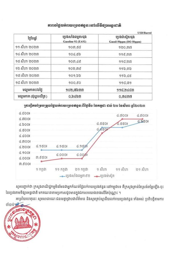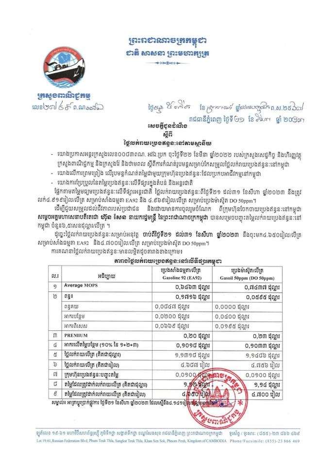 រាជធានីភ្នំពេញ៖ យោងតាមលិខិតរបស់ ក្រសួងពាណិជ្ជកម្ម ចុះផ្សាយថ្ងៃទី២១ ខែសីហា ឆ្នាំ២០២៣ ស្តីអំពីតម្លៃលក់រាយប្រេងឥន្ធនៈនៅតាមស្ថានីយទាំងអស់ក្នុងព្រះរាជាណាចក្រកម្ពុជាសម្រាប់អនុវត្តទៅតាមតម្លៃមធ្យមប្រេងឥន្ធនៈលើទីផ្សារអន្តរជាតិ ចាប់ពីថ្ងៃទី២១ ដល់ថ្ងៃទី៣១ ខែសីហា ឆ្នាំ២០២៣ បានឲ្យដឹងថា តម្លៃប្រេងសាំងធម្មតាមានតម្លៃ ៤,៦៥០រៀលក្នុងមួយលីត្រ ចំណែកឯប្រេងសាំងម៉ាស៊ូតមានតម្លៃ ៤,៧០០រៀលក្នុងមួយលីត្រប៉ុណ្ណោះ។