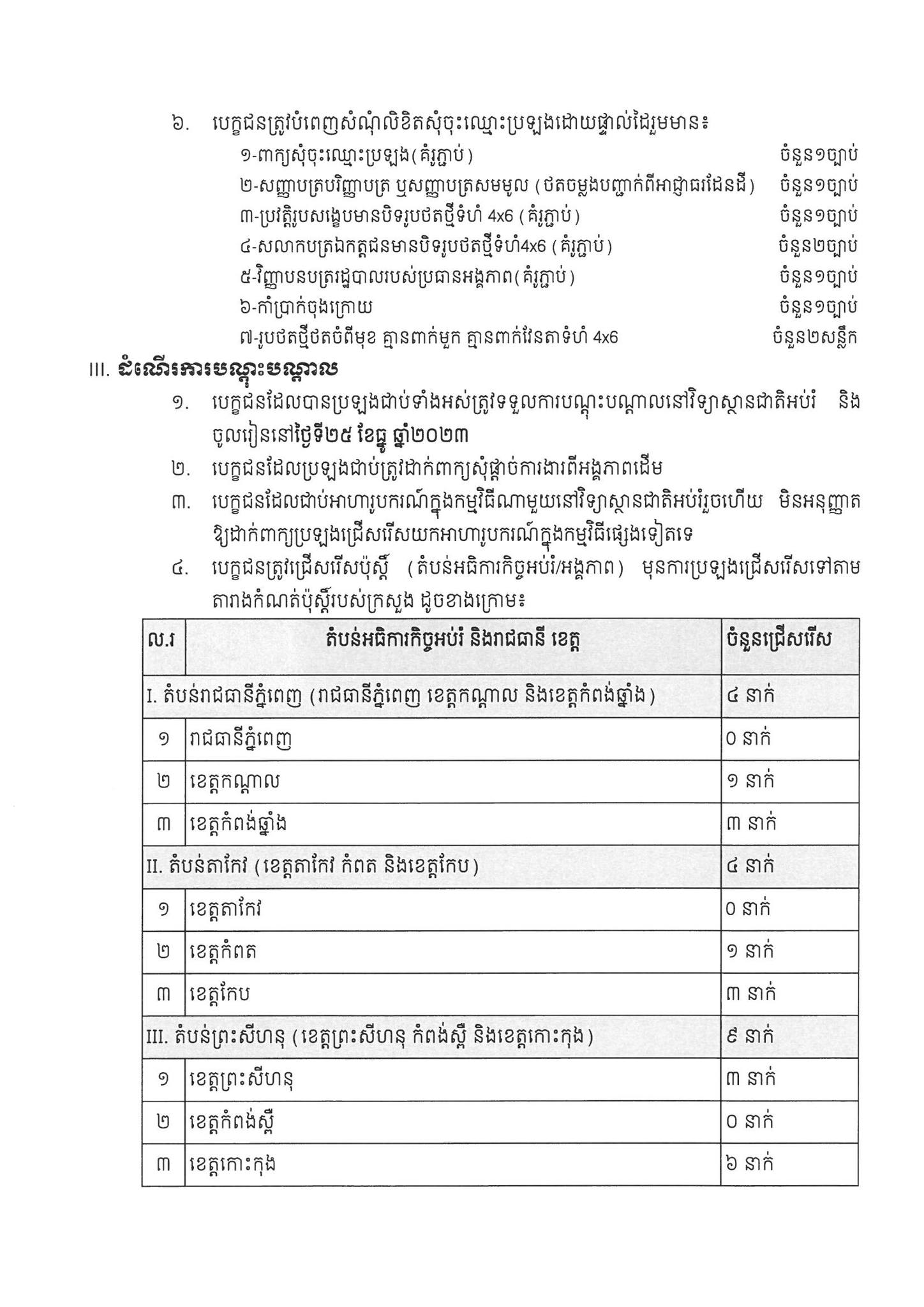 ១. កាលបរិច្ឆេទទទួលពាក្យសុំចុះឈ្មោះប្រឡង៖ ចាប់ពីថ្ងៃប្រកាសផ្សាយដំណឹងនេះ រហូតដល់ថ្ងៃទី ១០ ខែវិច្ឆិកា ឆ្នាំ២០២៣ វេលាម៉ោង ១៧:០០នាទី