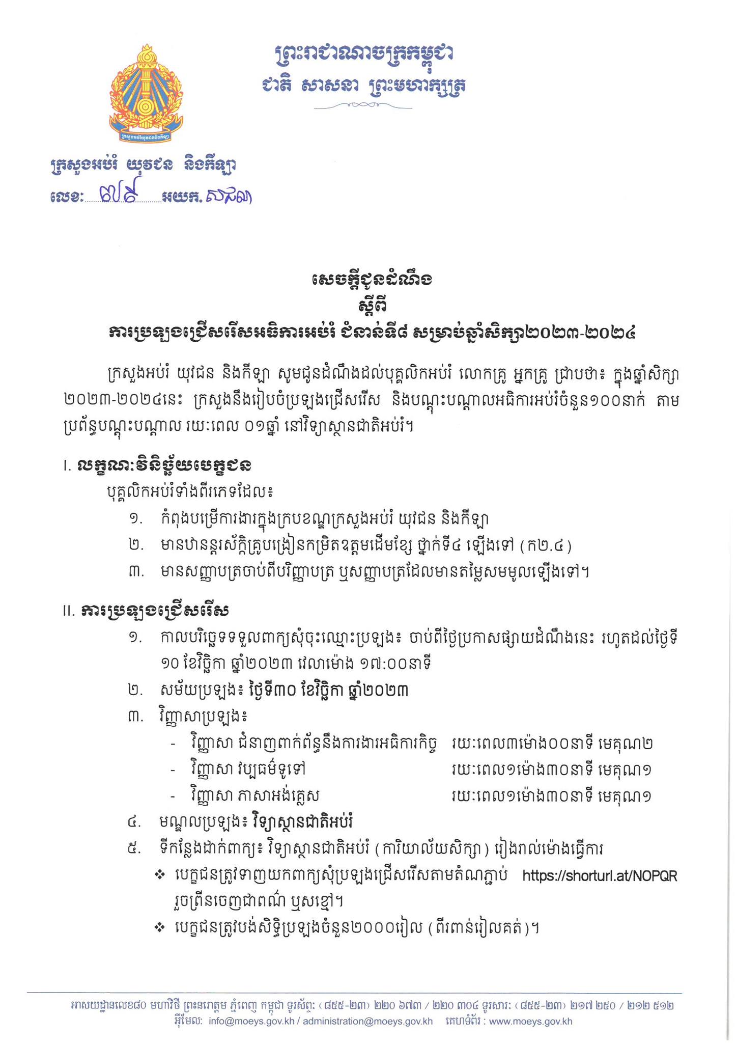 រាជធានីភ្នំពេញ៖ នៅថ្ងៃទី២១ ខែសីហា ឆ្នាំ២០២៣ យោងតាមការចុះផ្សាយរបស់ ក្រសួងអប់រំ យុវជន និងកីឡា បានចេញសេចក្ដីជូនដំណឹងដល់បុគ្គលិកអប់រំ លោកគ្រូ អ្នកគ្រូ ស្ដីពីការប្រឡងជ្រើសរើសអធិការអប់រំ ជំនាន់ទី៨ សម្រាប់ឆ្នាំសិក្សា២០២៣-២០២៤។