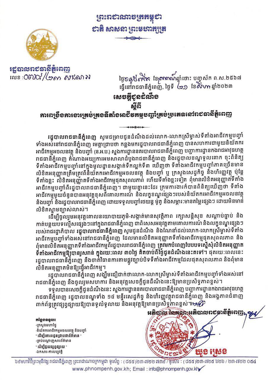 រាជធានីភ្នំពេញ៖ យោងតាមការចុះផ្សាយរបស់ រដ្ឋបាលរាជធានីភ្នំពេញ បានចេញសេចក្ដីជូនដំណឹង ស្តីពីការពង្រឹងការងារគ្រប់គ្រងទីតាំងអាជីវកម្មបញ្ចាំគ្រប់ប្រភេទ នៅរាជធានីភ្នំពេញ។