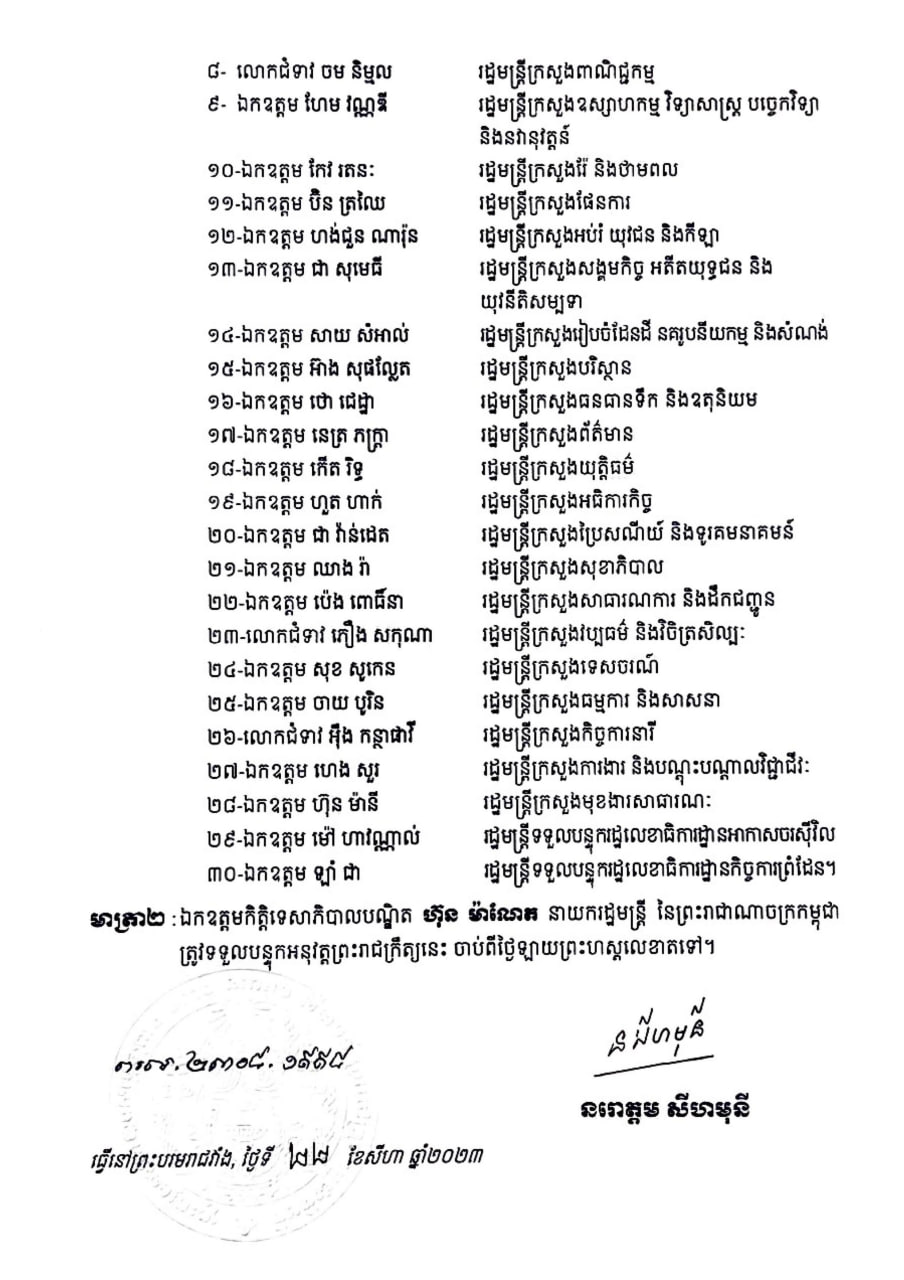 រាជធានីភ្នំពេញ៖ នៅថ្ងៃទី២២ ខែសីហា ឆ្នាំ២០២៣ ព្រះករុណា ព្រះបាទ សម្តេចព្រះ បរមនាថ នរោត្តម សីហមុនី ព្រះមហាក្សត្រនៃព្រះរាជាណាចក្រកម្ពុជា បានចេញព្រះរាជក្រឹត្យមួយ តែងតាំងគណៈរដ្ឋមន្រ្តី សម្រាប់អាណត្តិទី៧ ដែលមាន ឯកឧត្តមបណ្ឌិត ហ៊ុន ម៉ាណែត ជានាយករដ្ឋមន្រ្តី។