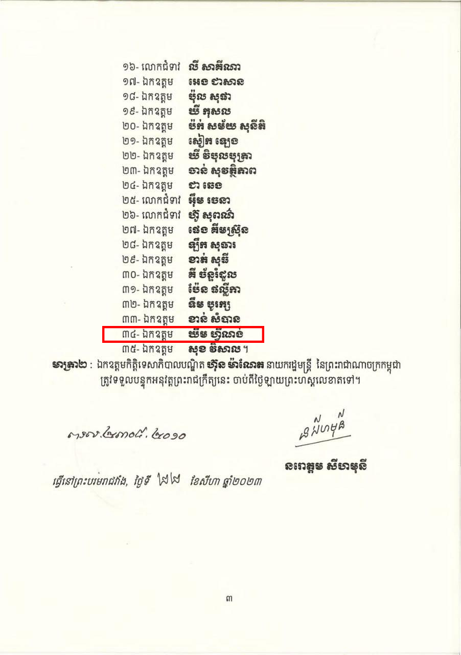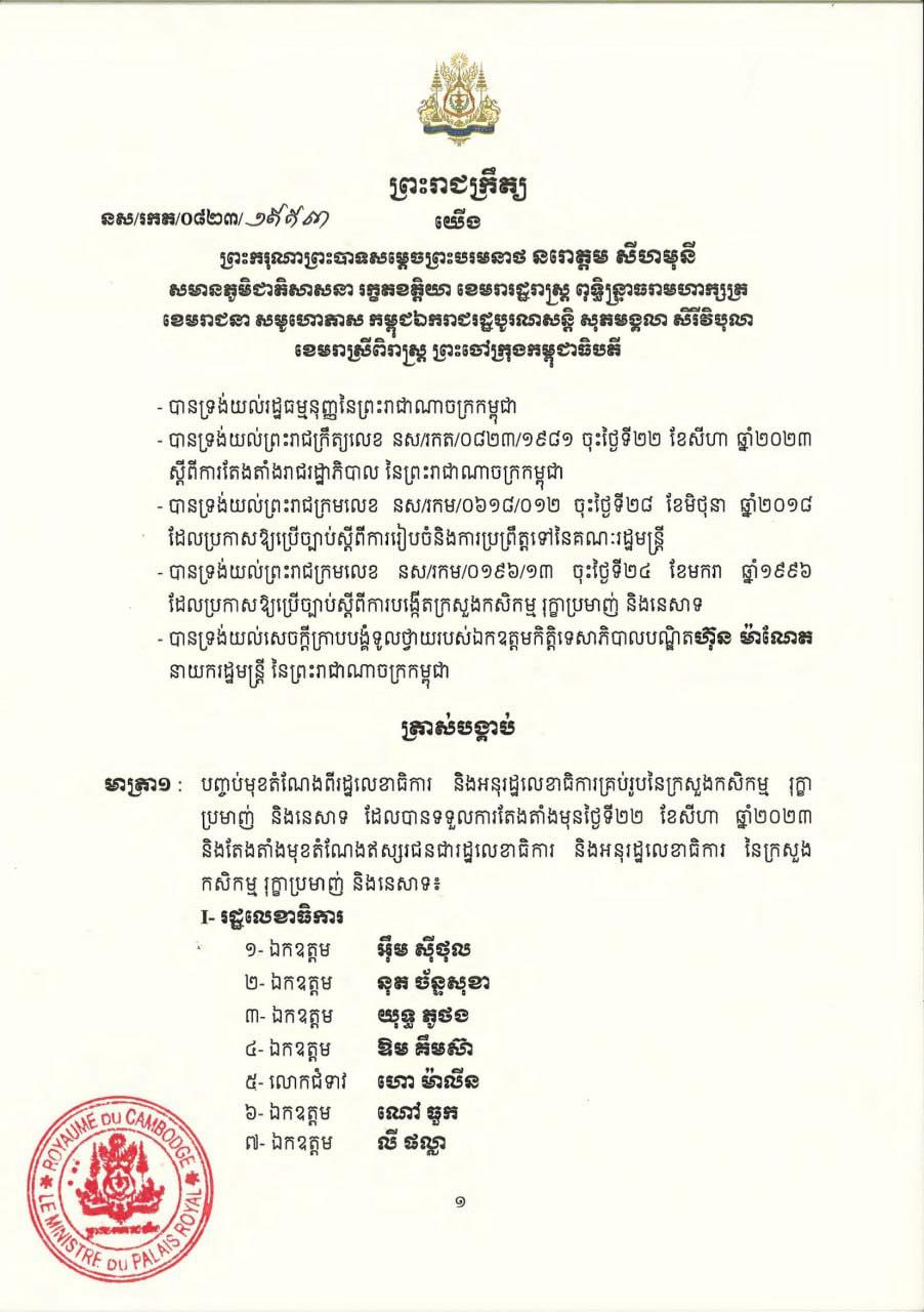 រាជធានីភ្នំពេញ៖ នៅថ្ងៃទី២២ ខែសីហា ឆ្នាំ២០២៣ យោងតាមព្រះរាជក្រឹត្យ ព្រះករុណា ព្រះបាទ សម្តេចព្រះ បរមនាថ នរោត្តម សីហមុនី ព្រះមហាក្សត្រនៃព្រះរាជាណាចក្រកម្ពុជា បានចេញព្រះរាជក្រឹត្យមួយ ត្រាស់បង្គាប់តែងតាំង លោក ឃឹម ហ្វីណង់ ជាអនុរដ្ឋលេខាធិការក្រសួងកសិកម្ម សម្រាប់អាណត្តិទី៧ ឆ្នាំ២០២៣។