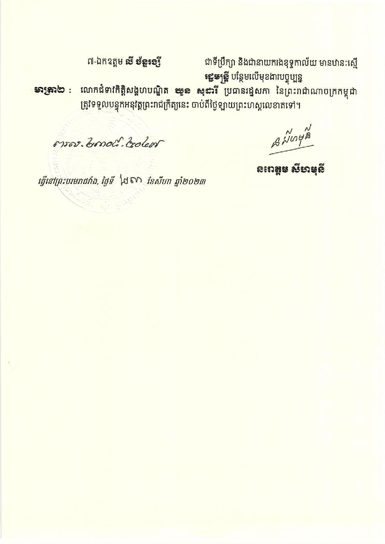 រាជធានីភ្នំពេញ៖ នៅថ្ងៃទី២៤ ខែសីហា ឆ្នាំ២០២៣ យោងតាមព្រះរាជក្រឹត្យ ព្រះករុណា ព្រះបាទសម្ដេច ព្រះបរមនាថ នរោត្តម សីហមុនី ព្រះមហាក្សត្រនៃព្រះរាជាណាចក្រកម្ពុជា ទ្រង់បានចេញព្រះរាជក្រឹត្យត្រាស់បង្គាប់តែងតាំង និងផ្តល់ឋានៈ ជាទីប្រឹក្សា នាយក និងនាយករង ខុទ្ទកាល័យលោកជំទាវកិត្តិសង្គហបណ្ឌិត ឃួន សុដារី ប្រធានរដ្ឋសភា នីតិកាលទី៧ នៃរដ្ឋសភា ចំនួន៧រូប មានឋានៈស្មើរទេសរដ្ឋមន្ត្រី និងរដ្ឋមន្ត្រី សម្រាប់នីតិកាលទី៧។
