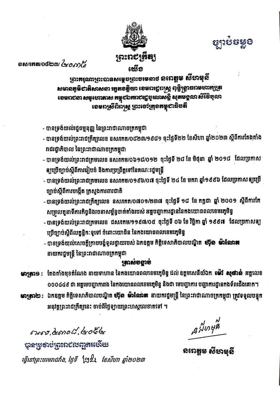 ព្រះមហាក្សត្រ ត្រាស់បង្គាប់តែងតាំងមុខតំណែង នាយទាហាន នៃកងយោធពលខេមរភូមិន្ទ ដល់ ឧត្តមសេនីយ៍ឯក. ម៉ៅ សុផាន់ អត្តលេខ ០០០៤៤៩ ជា អគ្គមេបញ្ជាការរង នៃកងយោធពលខេមរភូមិន្ទ និងជា មេបញ្ជាការ បញ្ជាការដ្ឋានកងទ័ពជើងគោក ៕
