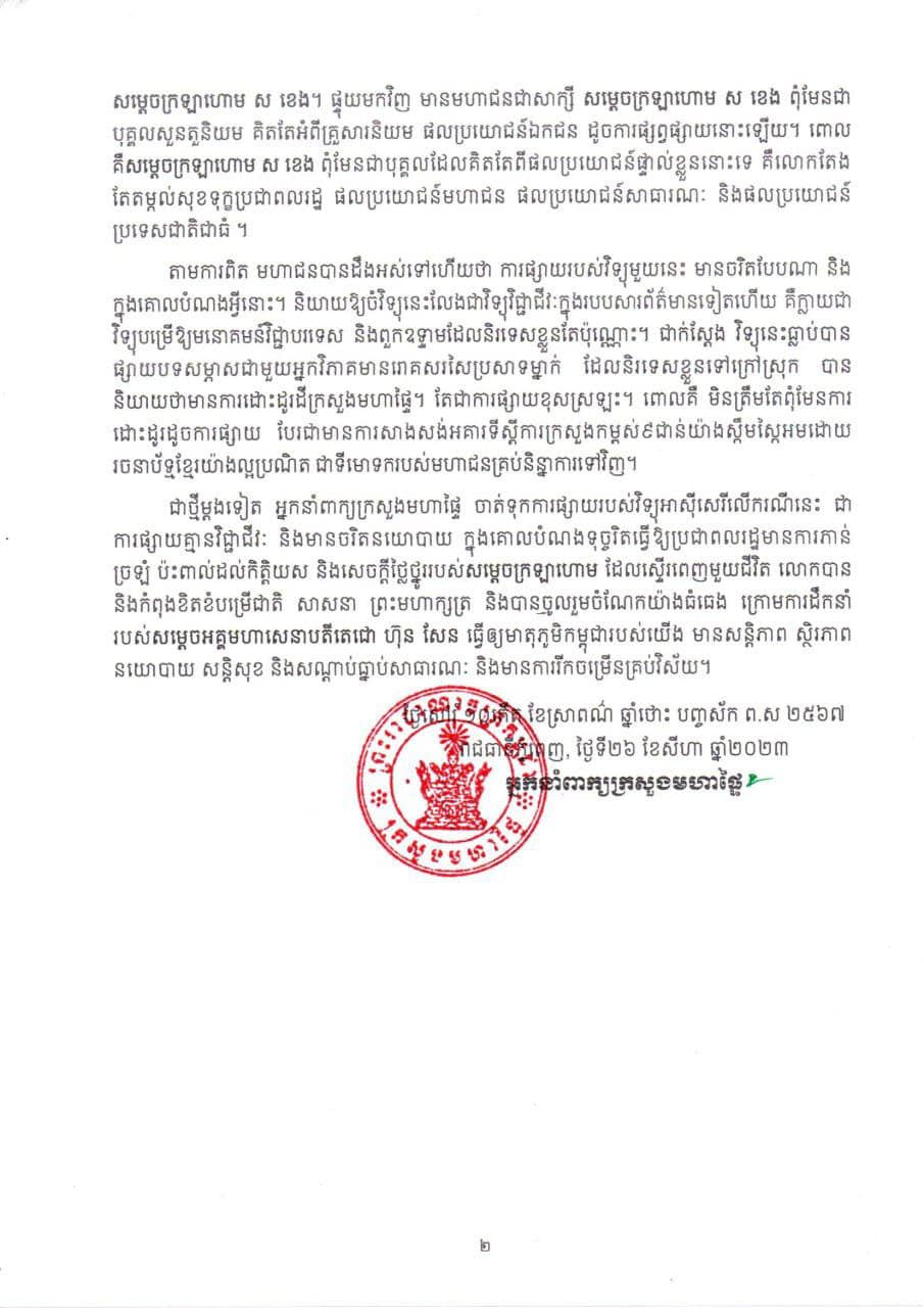 រាជធានីភ្នំពេញ៖ នៅថ្ងៃទី២៦ ខែសីហា ឆ្នាំ២០២៣ យោងតាមការចុះផ្សាយរបស់ ក្រសួងមហាផ្ទៃ បានឱ្យដឹងថា អ្នកនាំពាក្យក្រសួងមហាផ្ទៃ សូមប្រកាសបដិសេធ និងច្រានចោលជាដាច់ខាតតបទៅនឹងការផ្សាយព័ត៌មានតាមគេហទំព័ររបស់វិទ្យុអាស៊ីសេរីជាភាសាខ្មែរ (RFA Khmer) នាថ្ងៃទី២៥ ខែសីហា ឆ្នាំ២០២៣ ក្រោមចំណងជើងថា “អ្នកឃ្លាំមើលរិះគន់ការតែងតាំងកូនចៅ និងសាច់ញាតិ លោក ស ខេង ស្អេកស្កះក្នុងក្រសួងមហាផ្ទៃ» ដោយសូមបកស្រាយជូនមហាជនបានជ្រាបដូចខាងក្រោម៖