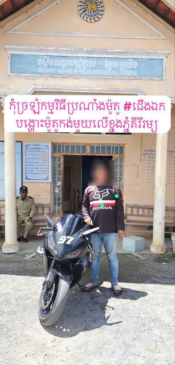 យុវជនម្នាក់បង្ហោះម៉ូតូធំបង្កសំលេងរំខានលើខ្នងភ្នំគីរីរម្យ ត្រូវបានសមត្ថកិច្ចស្រុកភ្នំស្រួច ឃាត់ខ្លួនយកមកអប់រំ