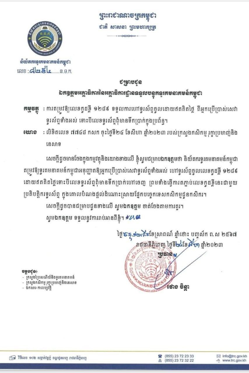 និយ័តករទូរគមនាគមន៍កម្ពុជា តម្រូវឱ្យទូរគមនាគមន៍កម្ពុជាអនុញ្ញាតឱ្យអ្នកប្រើប្រាស់សេវាទូរស័ព្ទទាំងអស់ ហៅទូរស័ព្ទចូលលេខកូដខ្លី ១២៨៩ ដោយឥតគិតថ្លៃ ទោះបីលេខទូរស័ព្ទពុំមានទឹកប្រាក់ហៅចេញ ព្រមទាំងធ្វើការតភ្ជាប់លេខកូដខ្លីនេះជាមួយ ប្រតិបត្តិករទូរស័ព្ទ ក្នុងគោលបំណងផ្តល់ដំណោះស្រាយផ្នែកបច្ចេកទេសកសិកម្មជូនកសិករ។ សេចក្តីដូចបានជម្រាបជូនខាងលើ សូមឯកឧត្តម ចាត់ចែងតាមការគួរ ៕​