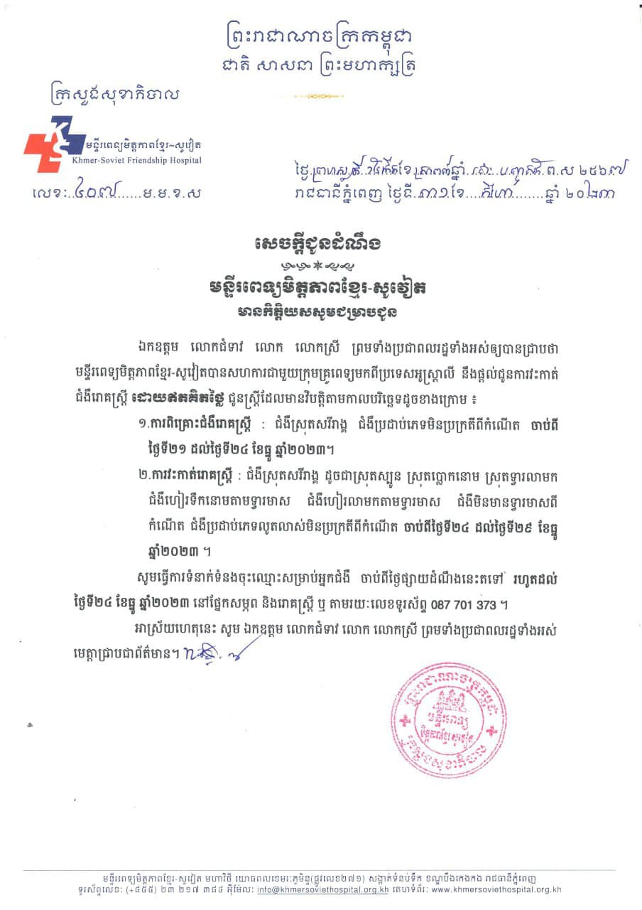 សូមធ្វើការទំនាក់ទំនងចុះឈ្មោះសម្រាប់អ្នកជំងឺ ចាប់ពីថ្ងៃផ្សាយដំណឹងនេះតទៅ រហូតដល់ ថ្ងៃទី២៤ ខែធ្នូ ឆ្នាំ២០២៣ នៅផ្នែកសម្ភព និងរោគស្ត្រី ឬ តាមរយៈលេខទូរស័ព្ទ 087 701 373 ។ អាស្រ័យហេតុនេះ សូម ឯកឧត្តម លោកជំទាវ លោក លោកស្រី ព្រមទាំងប្រជាពលរដ្ឋទាំងអស់ មេត្តាជ្រាបជាព័ត៌មាន ៕