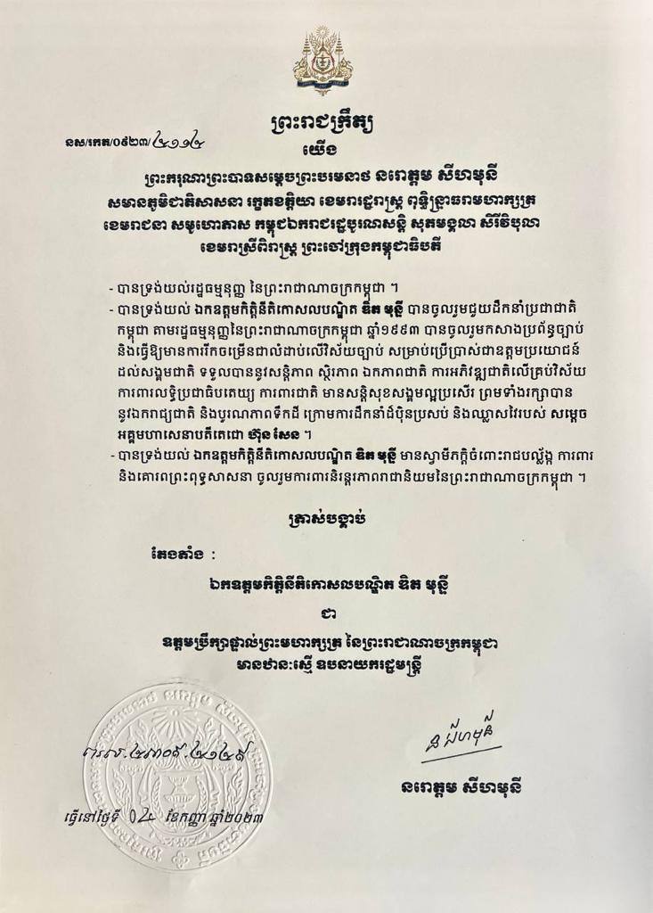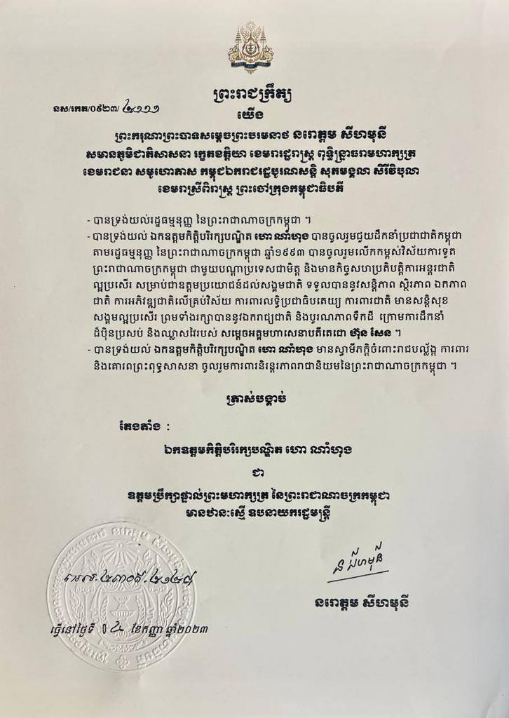 រាជធានីភ្នំពេញ៖ នៅថ្ងៃទី០៤ ខែកញ្ញា ឆ្នាំ២០២៣ យោងតាមព្រះរាជក្រឹត្យ ព្រះករុណា ព្រះបាទ សម្តេចព្រះបរមនាថ នរោត្តម សីហមុនី ព្រះមហាក្សត្រនៃព្រះរាជាណាចក្រកម្ពុជា ទ្រង់បានចេញព្រះរាជក្រឹត្យត្រាស់បង្គាប់តែងតាំង ឯកឧត្តម ហោ ណាំហុង និង ឯកឧត្តម ឌិត មន្ទី ជាឧត្តមប្រឹក្សាផ្ទាល់ព្រះមហាក្សត្រ មានឋានៈស្មើ ឧបនាយករដ្ឋមន្ត្រី ៕