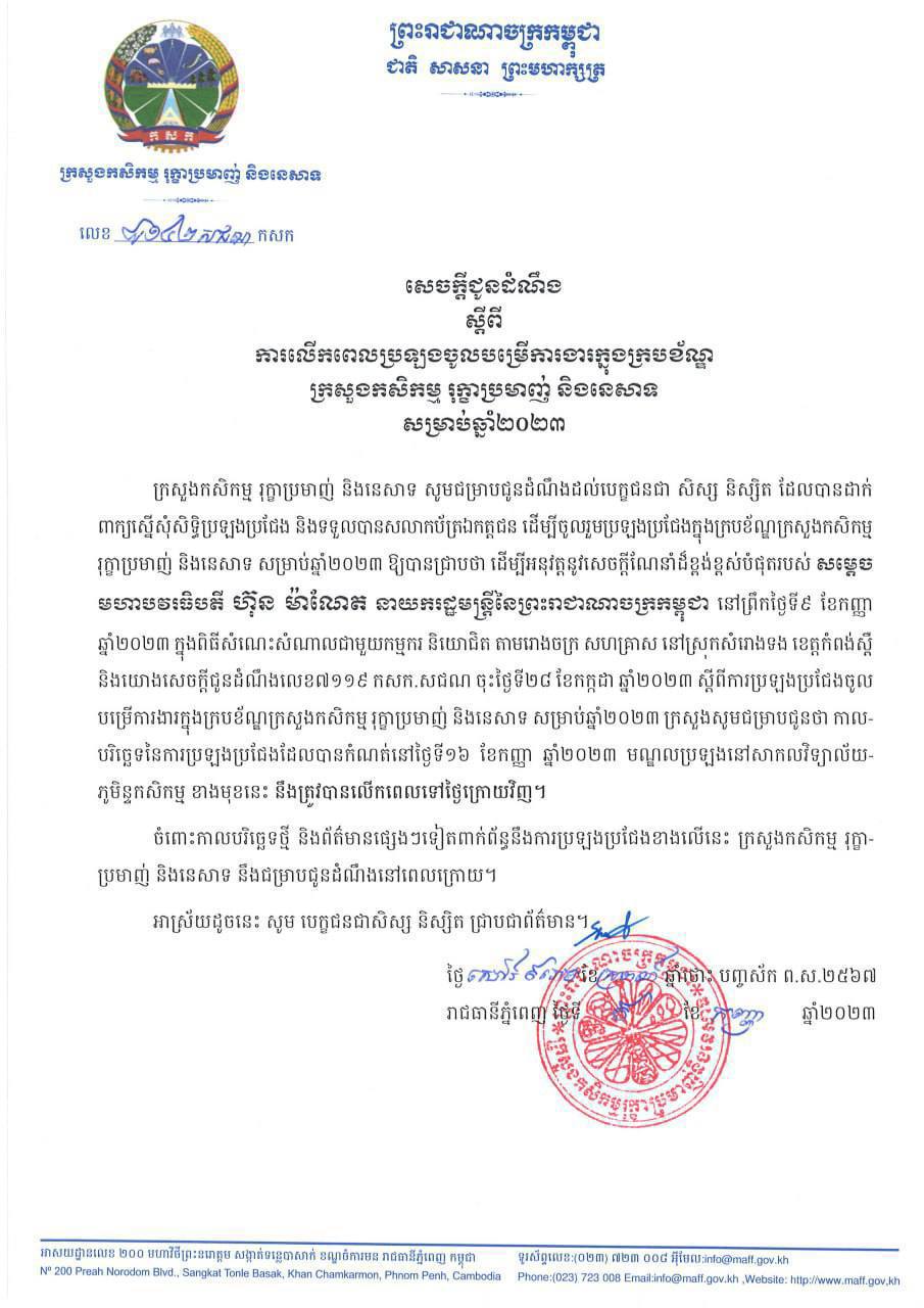 ក្រសួងកសិកម្ម រុក្ខាប្រមាញ់ និងនេសាទ សូមជម្រាបជូនដំណឹងដល់បេក្ខជនជា សិស្ស និស្សិត ដែលបានដាក់ ពាក្យស្នើសុំសិទ្ធិប្រឡងប្រជែង និងទទួលបានសលាកប័ត្រឯកត្តជន ដើម្បីចូលរួមប្រឡងប្រជែងក្នុងក្របខ័ណ្ឌក្រសួងកសិកម្ម រុក្ខាប្រមាញ់ និងនេសាទ សម្រាប់ឆ្នាំ២០២៣ ឱ្យបានជ្រាបថា៖