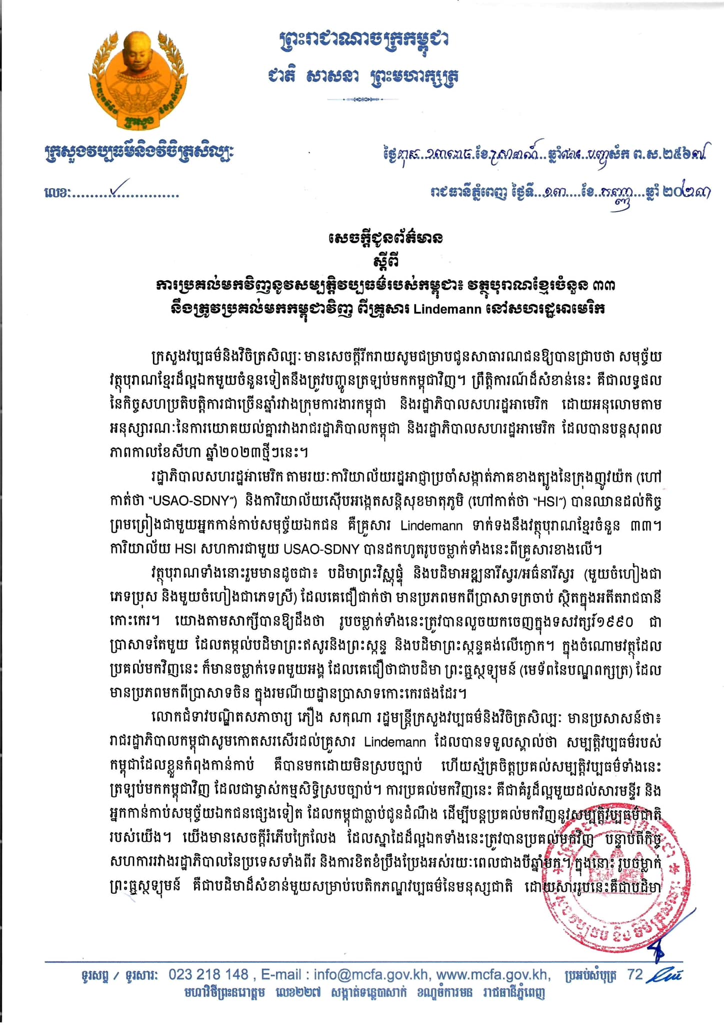 ក្រសួងវប្បធម៌និងវិចិត្រសិល្បៈ មានសេចក្តីរីករាយសូមជម្រាបជូនសាធារណជនឱ្យបានជ្រាបថា សមុច្ច័យ វត្ថុបុរាណខ្មែរដ៏ល្អឯកមួយចំនួនទៀតនឹងត្រូវបញ្ជូនត្រឡប់មកកម្ពុជាវិញ។ ព្រឹត្តិការណ៍ដ៏សំខាន់នេះ គឺជាលទ្ធផល នៃកិច្ចសហប្រតិបត្តិការជាច្រើនឆ្នាំរវាងក្រុមការងារកម្ពុជា និងរដ្ឋាភិបាលសហរដ្ឋអាមេរិក ដោយអនុលោមតាម អនុស្សារណៈនៃការយោគយល់គ្នារវាងរាជរដ្ឋាភិបាលកម្ពុជា និងរដ្ឋាភិបាលសហរដ្ឋអាមេរិក ដែលបានបន្តសុពល ភាពកាលខែសីហា ឆ្នាំ២០២៣ថ្មីៗនេះ។