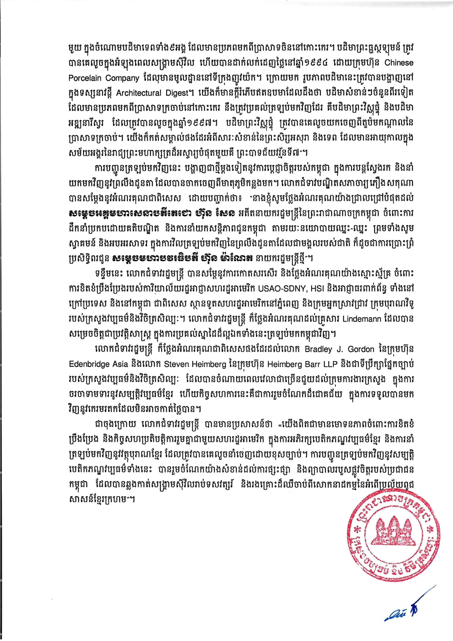 យើងមានសេចក្តីរំភើបក្រៃលែង ដែលស្នាដៃដ៏ល្អឯកទាំងនេះត្រូវបានប្រគល់មកវិញ បន្ទាប់ពីកិច្ច សហការរវាងរដ្ឋាភិបាលនៃប្រទេសទាំងពីរ និងការខិតខំប្រឹងប្រែងអស់រយៈពេលជាងបីឆ្នាំមក។ ក្នុងនោះ រូបចម្លាក់ ព្រះធ្នស្ថទ្យុមន៍ គឺជាបដិមាដ៏សំខាន់មួយសម្រាប់បេតិកភណ្ឌវប្បធម៌នៃមនុស្សជាតិ ដោយសាររូបនេះគឺជាបដិមាមួយ ក្នុងចំណោមបដិមាទេពទាំង៩អង្គ ដែលមានប្រភពមកពីប្រាសាទចិននៅកោះកេរ។ បដិមា ព្រះធ្នស្ថទ្យុមន៍ ត្រូវបានគេលួចក្នុងអំឡុងពេលសង្គ្រាមស៊ីវិល ហើយបានដាក់លក់ដេញថ្លៃនៅឆ្នាំ១៩៩៤ ដោយក្រុមហ៊ុន Chinese Porcelain Company ដែលមានមូលដ្ឋាននៅទីក្រុងញូវយ៉ក។ ក្រោយមក រូបភាពបដិមានេះត្រូវបានបង្ហាញនៅ ក្នុងទស្សនាវដ្តី Architectural Digest។ យើងក៏មានក្តីរំភើបឥតឧបមាដែលដឹងថា បដិមាសំខាន់ៗចំនួនពីរទៀត ដែលមានប្រភពមកពីប្រាសាទក្រចាប់នៅកោះកេរ នឹងត្រូវប្រគល់ត្រឡប់មកវិញដែរ គឺបដិមាព្រះវិស្ណុផ្ទុំ និងបដិមា អឌ្ឍនារីស្វរ ដែលត្រូវបានលួចក្នុងឆ្នាំ១៩៩៧។ បដិមាព្រះវិស្ណុផ្ទុំ ត្រូវបានគេលួចយកចេញពីតួប៉មកណ្ដាលនៃ ប្រាសាទក្រចាប់។ យើងក៏កត់សម្គាល់ផងដែរអំពីសារៈសំខាន់នៃព្រះសិរ្សអសុរា និងទេព ដែលមានអាយុកាលក្នុង សម័យអង្គរនៃរាជ្យព្រះមហាក្សត្រដ៏អស្ចារ្យបំផុតមួយគឺ ព្រះបាទជ័យវរ្ម័នទី៧” ៕