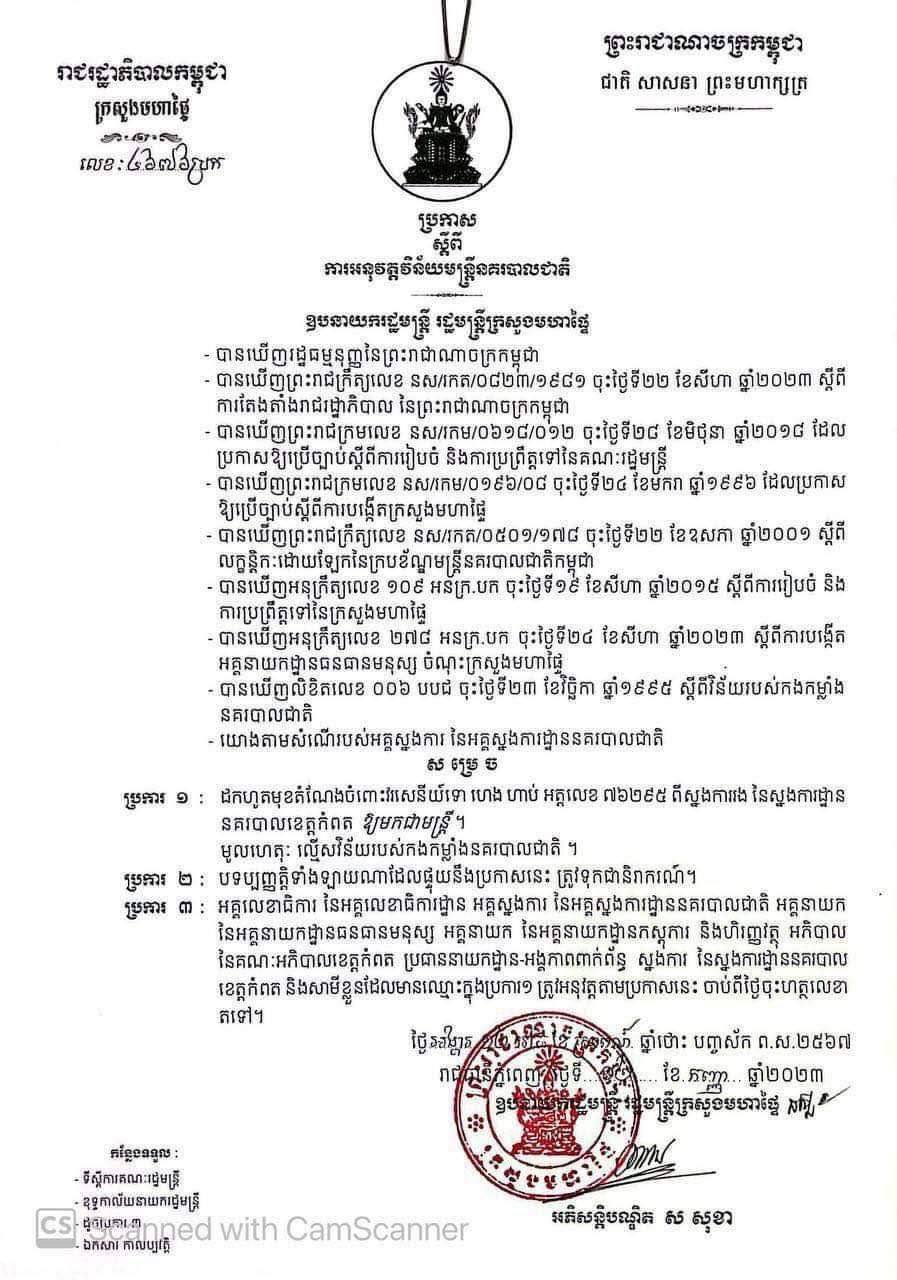 ក្រសួងមហាផ្ទៃ សម្រេចដកហូតមុខតំណែងចំពោះវរសេនីយ៍ទោ ហេង ហាប់ អត្តលេខ ៧៦២៩៥ ពីស្នងការរង នៃស្នងការដ្ឋាន នគរបាលខេត្តកំពត ឱ្យមកជាមន្ត្រី។ មូលហេតុ ល្មើសវិន័យរបស់កងកម្លាំងនគរបាលជាតិ ៕