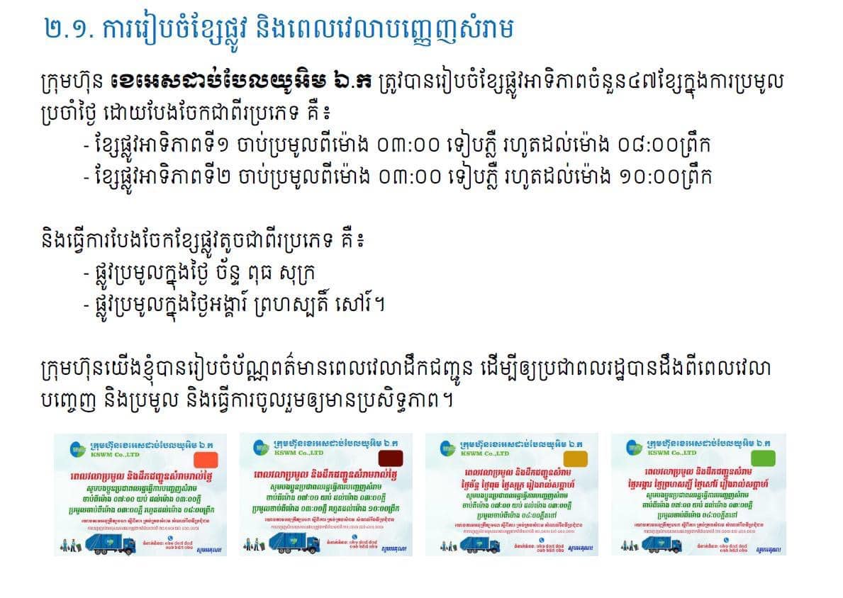 ក្រៅពីក្រុមហ៊ុនប្រមូលសំរាម KSWM ក៏មានក្រុមហ៊ុនប្រមូលកាកសំណល់សំណង់ ២ទៀត ដែលកំពុងប្រតិបត្តិការក្នុងក្រុងព្រះសីហនុ ដោយការទទួលខុសត្រូវ យើងត្រូវបើកយុទ្ធនាការអប់រំផ្សព្វផ្សាយ ចុះបិទស្ទីកឃ័រនៅតាមខ្នងផ្ទះប្រជាពលរដ្ឋ ស្តីពីការបញ្ចេញ និងប្រមូលសំរាម ទាក់ទងសំរាមនៅតាមផ្លូវតូច ប្រជាពលរដ្ឋអាចបញ្ចេញសំរាមដោយខ្លួនឯងនៅម៉ោង ៨ដល់ ១០យប់ ឱ្យមានតម្លាភាព ត្រូវឯកភាពគ្នាតាមកម្មវិធីនៃការបញ្ចេញសំរាម និងការប្រមូលសំរាម ដើម្បីសោភ័ណភាពក្រុងព្រះសីហនុស្អាត បៃតង ហើយអ្នកដែលមិនបានចូលរួមនៅតែបំពាននឹងត្រូវធ្វើការផាកពិន័យតាមអនុក្រឹត្យលេខ១១៣ ៕