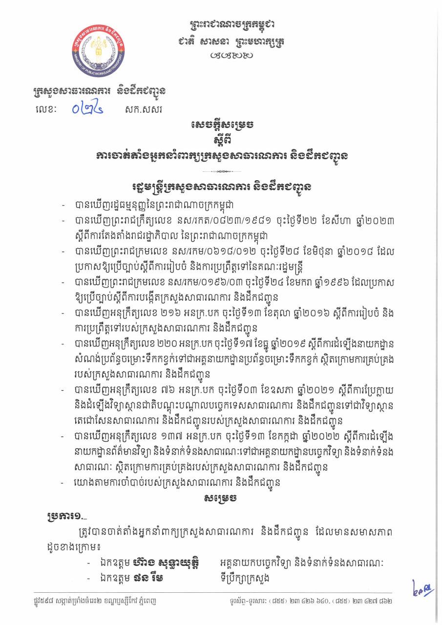 រាជធានីភ្នំពេញ៖ នៅថ្ងៃទី២២ ខែកញ្ញា ឆ្នាំ២០២៣ យោងតាមការចុះផ្សាយរបស់ ក្រសួងសាធារណការ និងដឹកជញ្ជូន បានចេញសេចក្ដី សម្រេចចាត់តាំងឯកឧត្តម ហ៊ាង សុទ្ធាយុត្តិ អគ្គនាយកបច្ចេកវិទ្យា និងទំនាក់ទំនងសាធារណៈ ជាអ្នកនាំពាក្យក្រសួង។