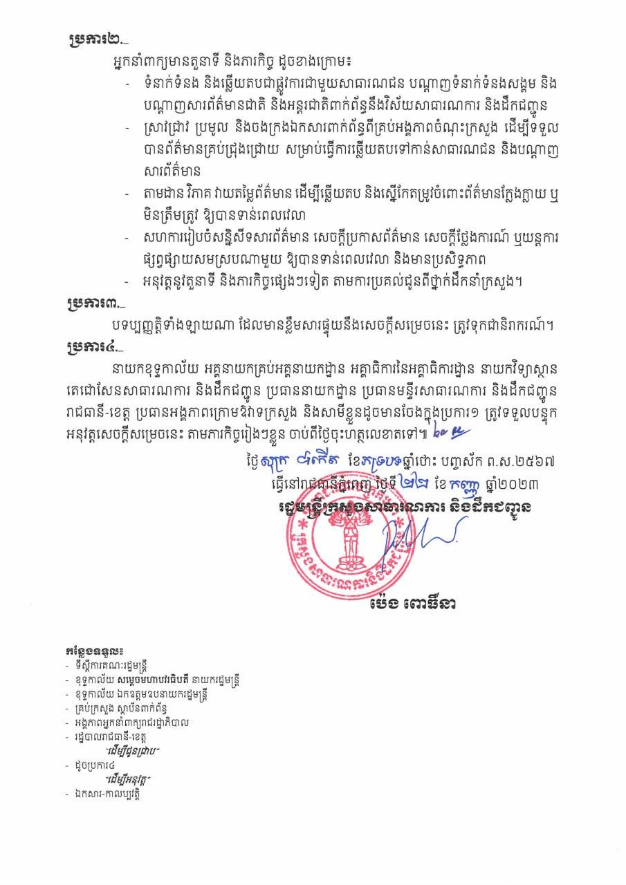 – ទំនាក់ទំនង និងឆ្លើយតបជាផ្លូវការជាមួយសាធារណជន បណ្ដាញទំនាក់ទំនងសង្គម និង បណ្តាញសារព័ត៌មានជាតិ និងអន្តរជាតិពាក់ព័ន្ធនឹងវិស័យសាធារណការ និងដឹកជញ្ជូន