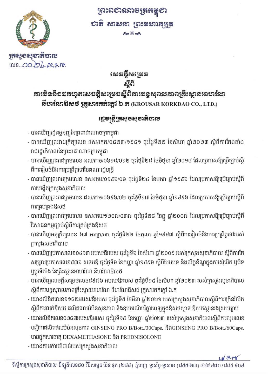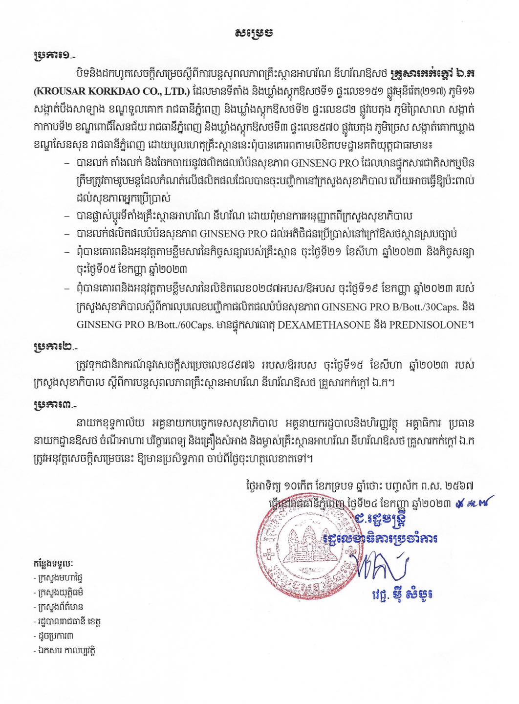 (ភ្នំពេញ)៖ នៅថ្ងៃទី ២៤ ខែកញ្ញា ឆ្នាំ ២០២៣ ក្រសួងសុខាភិបាល បានចេញនូវសេចក្ដីសម្រេចស្តីពីការបិទនិងដកហូតសេចក្តីសម្រេចស្តីពីការបន្តសុពលភាពគ្រឹះស្ថានអាហរ័ណ នីហរ័ណឱសថ គ្រួសារកក់ក្តៅ ឯ.ក (KROUSAR KORKDAO CO.,LTD.)។